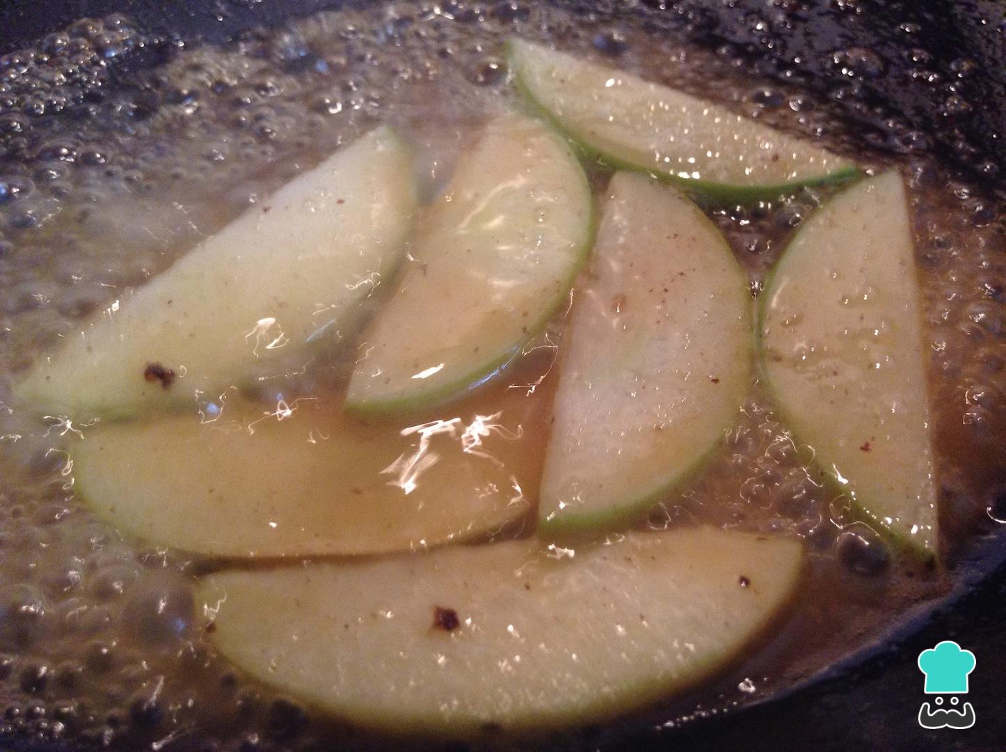 Coloque as fatias de maçã em uma frigideira a fogo médio, com uma pitada de açúcar e o vinho branco restante. Esse processo serve para caramelizar as maçãs usadas na decoração. Reserve.