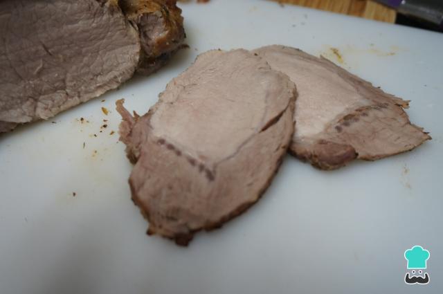 Corte a carne em fatias a partir do meio, para verificar se está no ponto. Se ainda estiver crua ou muito rosada, corte toda ela em fatias, regue com o caldo que se formou na assadeira e devolva ao forno por mais 5 minutos.