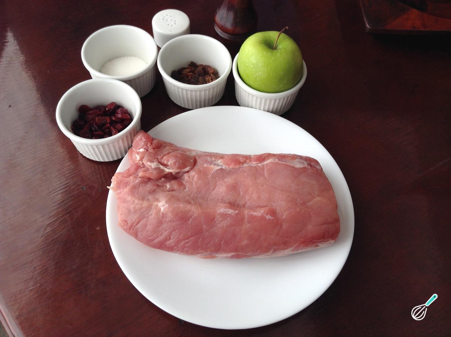 O primeiro passo para fazer esta receita de lombo de porco recheado é juntar todos os ingredientes. Idealmente, o lombo de porco deve pesar entre 1 kg e 1,5 kg. Se você quiser, pode substituir o açúcar por adoçante.