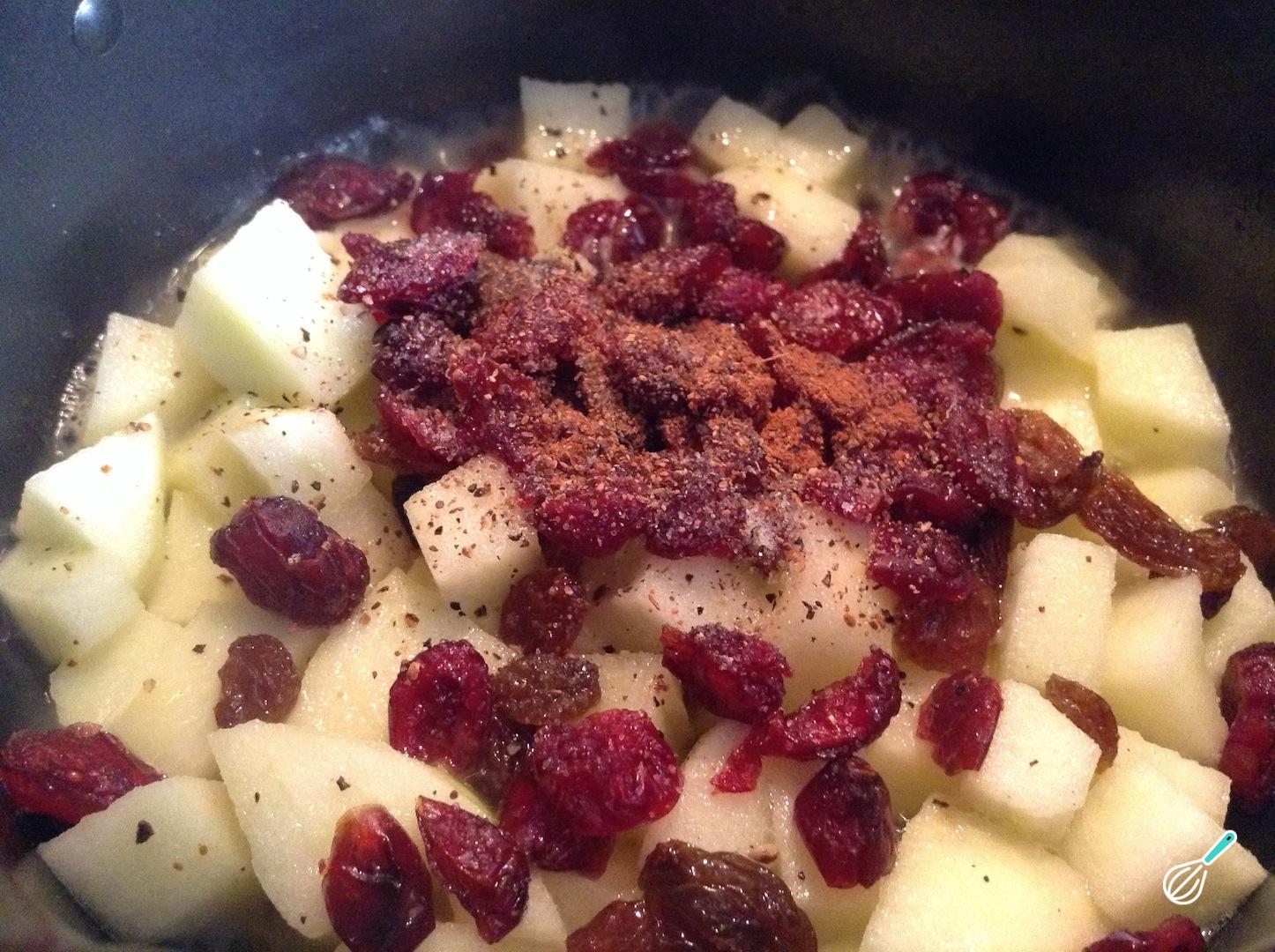 Para o recheio: coloque uma panela funda em fogo médio, adicione as maçãs descascadas, uma colher de sopa de manteiga e refogue por alguns minutos. Depois adicione os arandos e as uvas-passa com um pouco de sal e pimenta, envolva e baixe o fogo.
