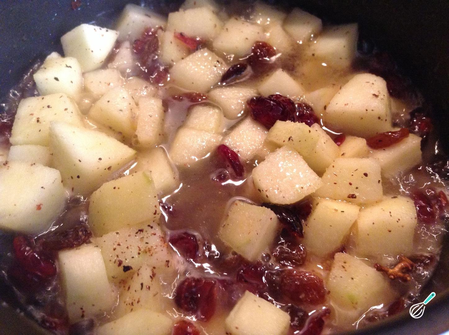 Adicione o vinho, para intensificar os sabores, e deixe cozinhar em fogo médio-baixo até a maçã amolecer. Desligue o fogo e deixe esfriar.