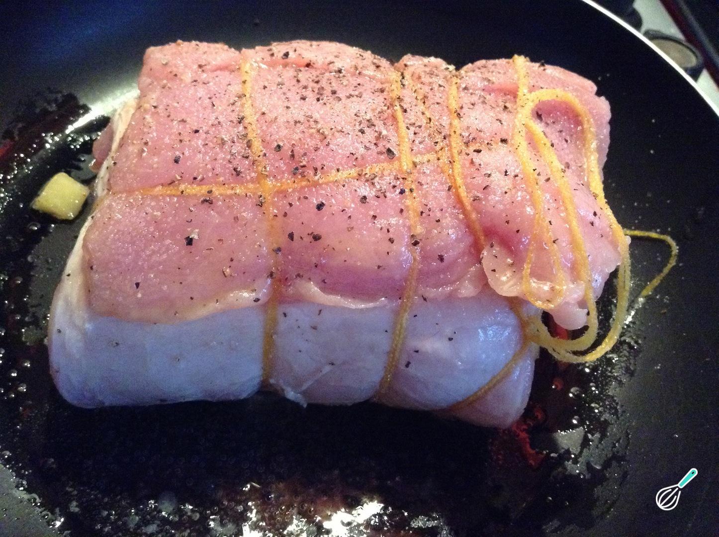 Enrole o lombo com o recheio no interior, e amarre com fio barbante. Leve ao fogo médio uma frigideira com um pouco de óleo ou manteiga e doure o lombo de todos os lados para que, depois de assar, se mantenha tenro no interior.