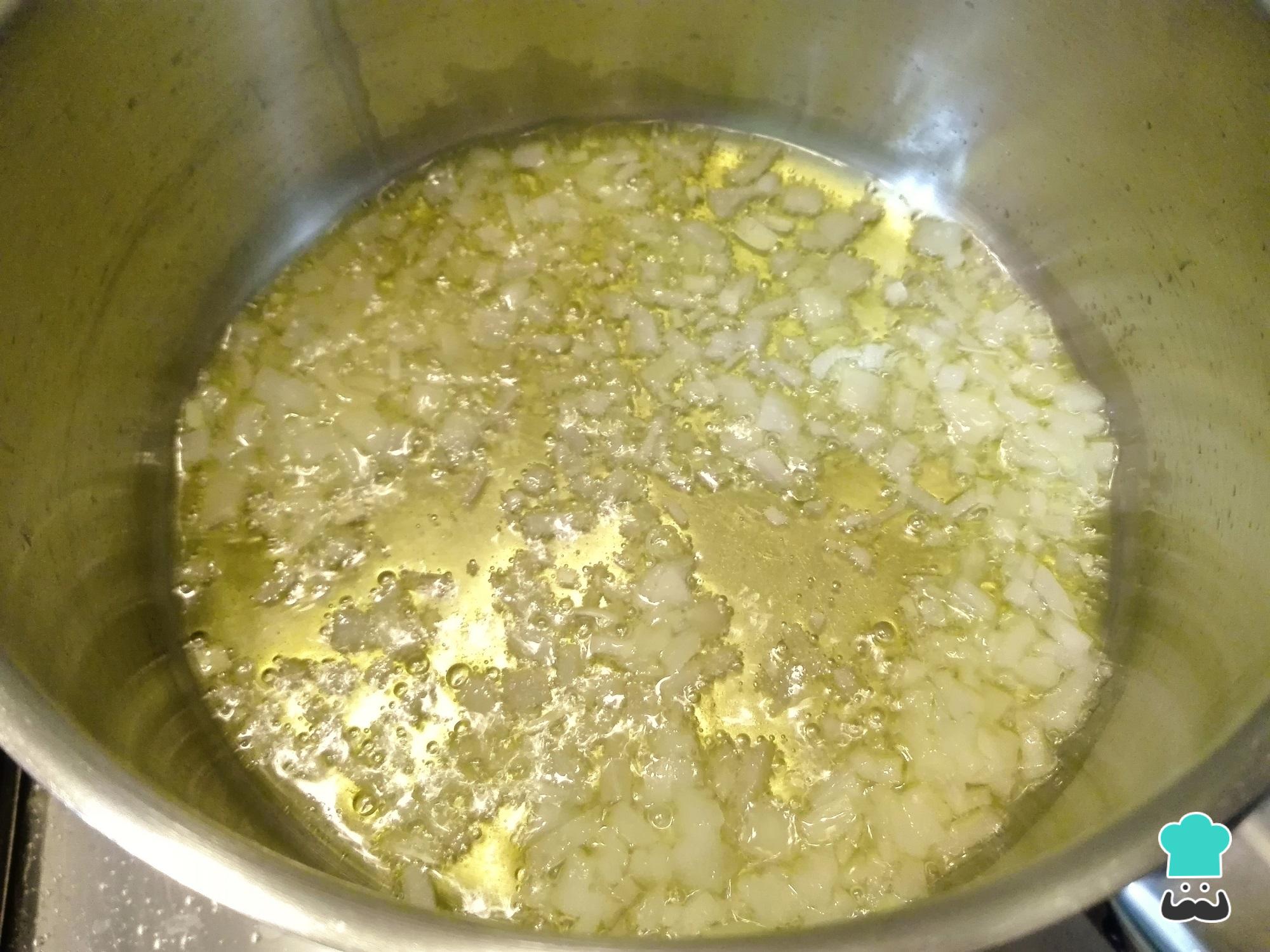 Para fazer lombo na panela de pressão com vinho, comece por colocar um fio de azeite, o alho, a cebola e a folha de louro na panela de pressão. Quando a cebola ficar transparente, junte a mostarda e a polpa de tomate e deixe refogar um pouco.