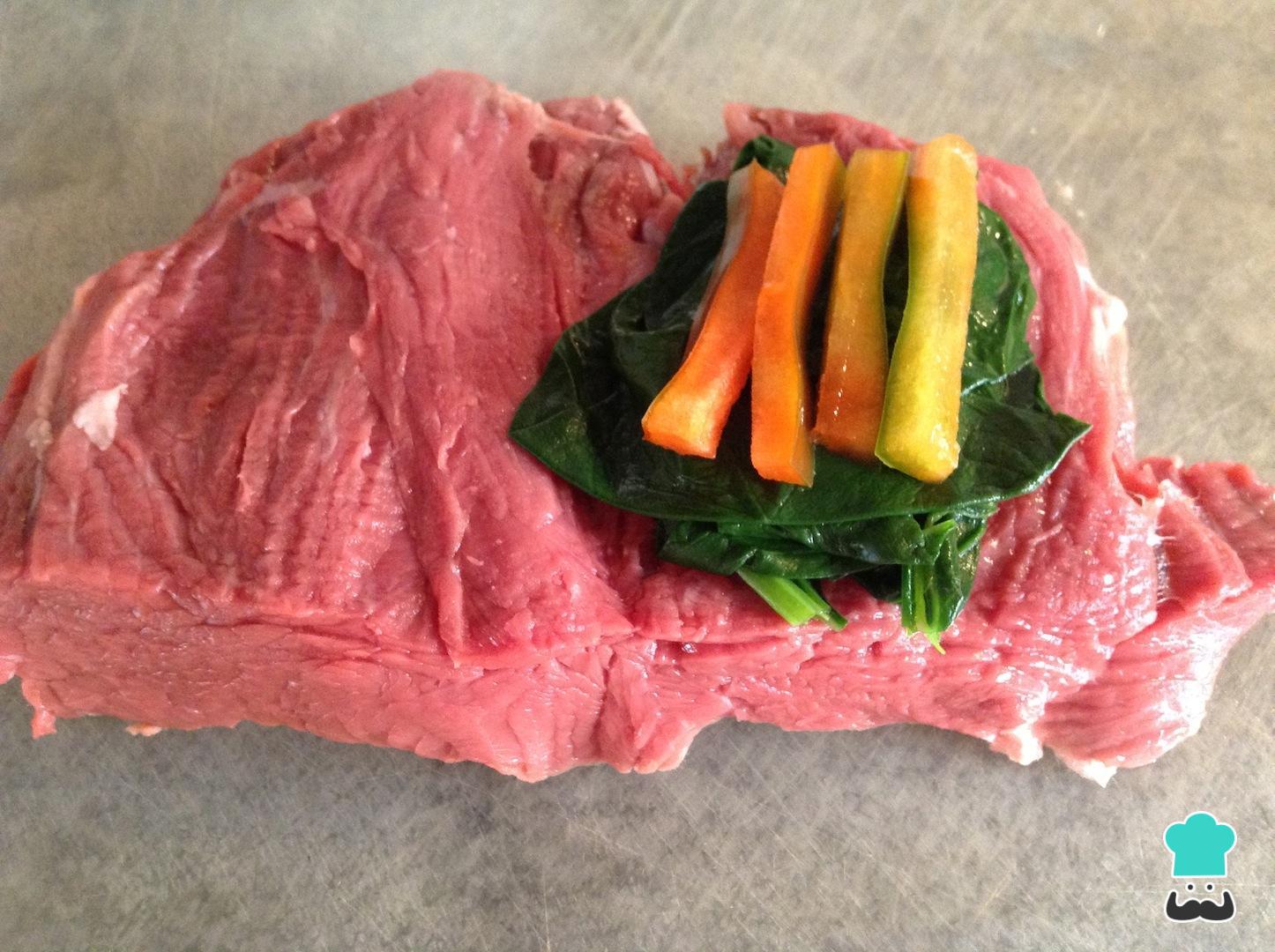 Recheie o lombo: coloque numa das metades as folhas de espinafre e o pimentão cortado em tiras. Reserve.