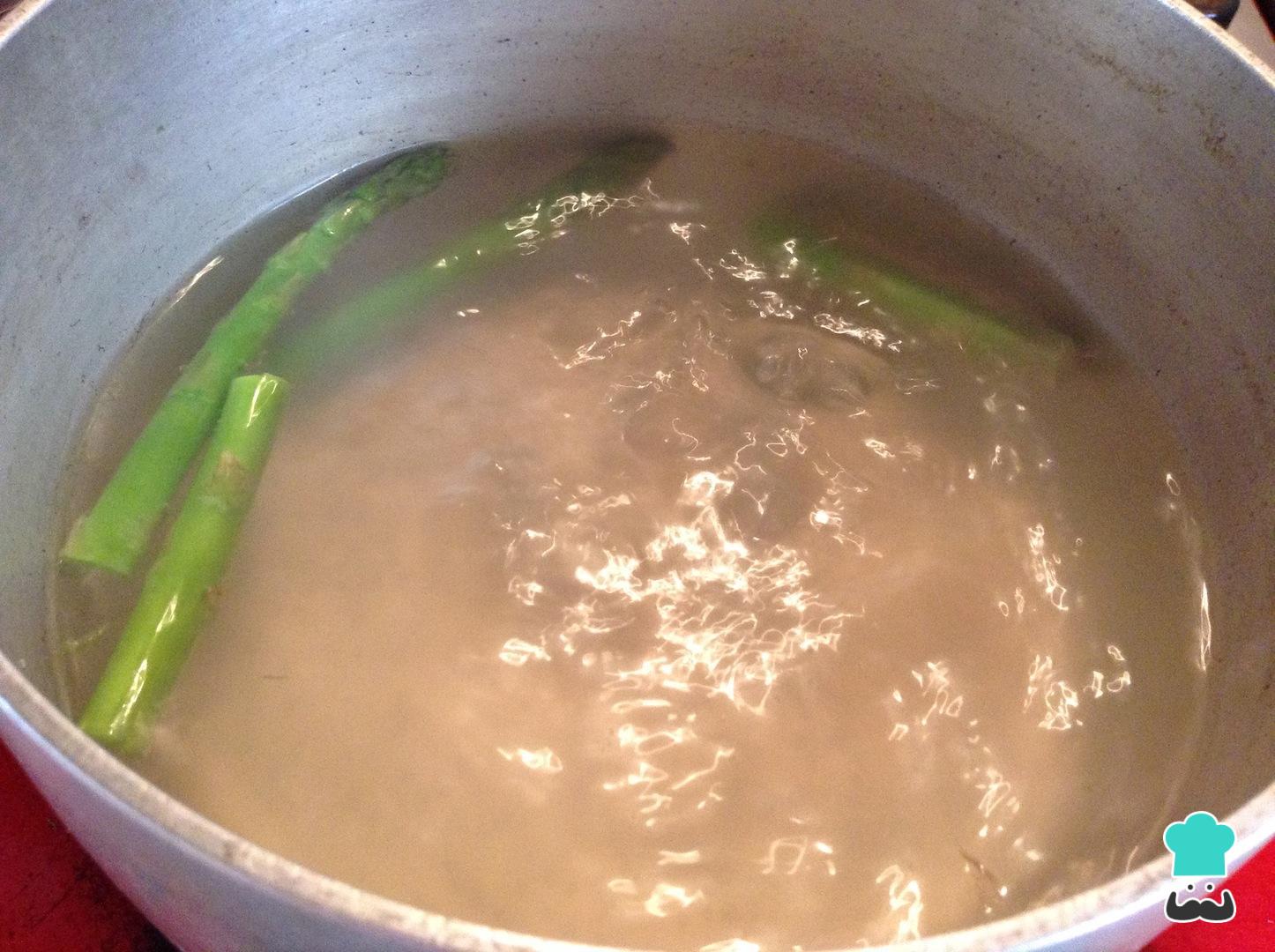 Numa panela com água fervente cozinhe os aspargos por 5 minutos, no máximo. Após esse tempo, retire para um recipiente com água fria, para que não cozinhem demasiado.