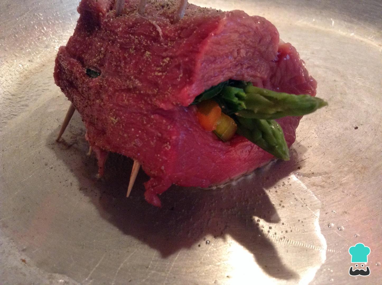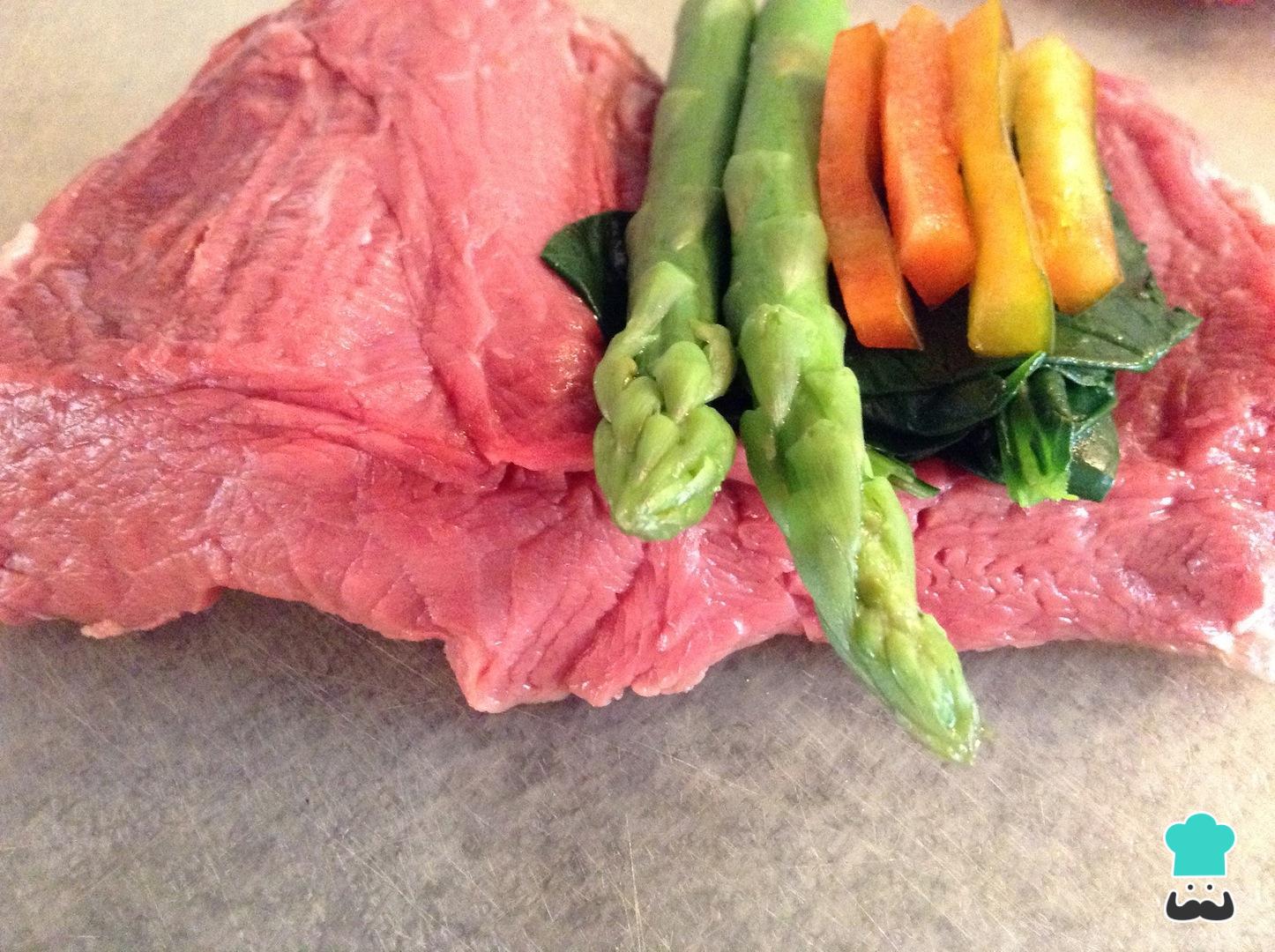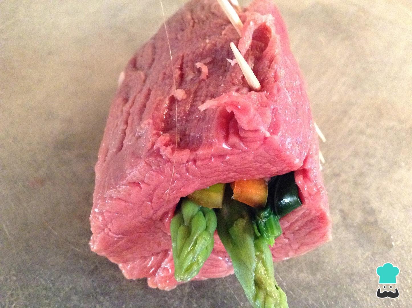 Junte os aspargos aos restantes ingredientes do recheio do lombo.