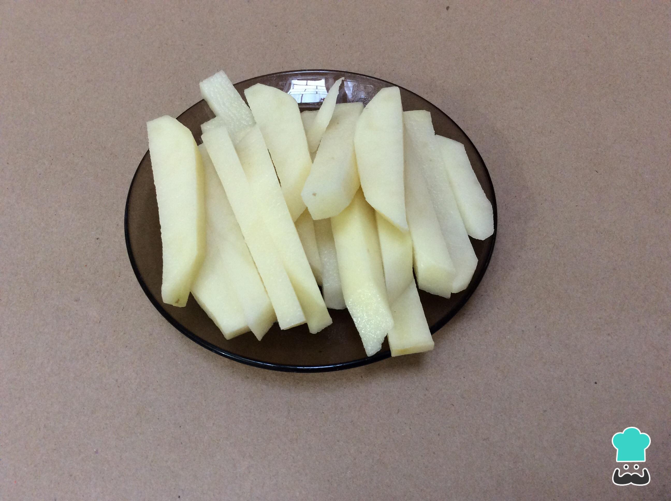 Descasque a batata, lave e corte em palitos não muito grossos, para fazer batatas fritas.