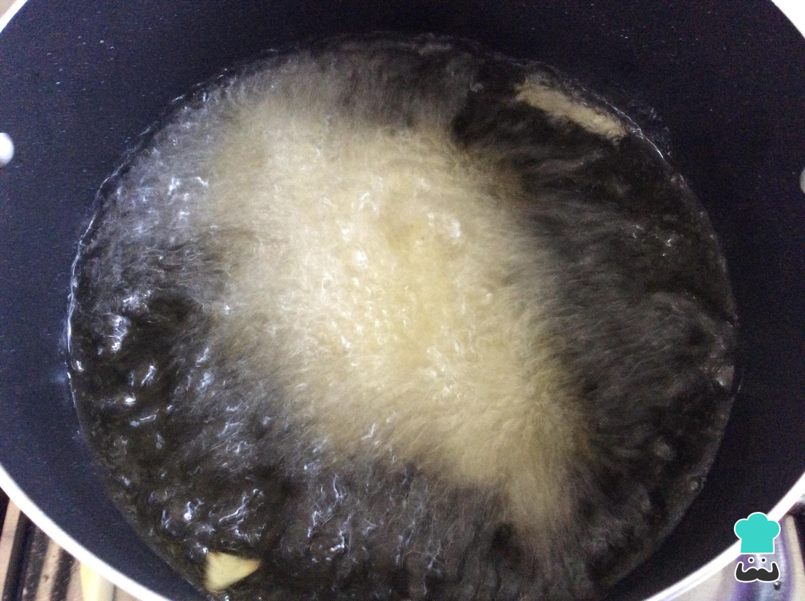 Leve ao fogo médio uma panela com óleo abundante e, quando estiver bem quente, acrescente as batatas para fritar. Deixe cozinhar até que estejam douradas, e retire para um prato com papel absorvente.