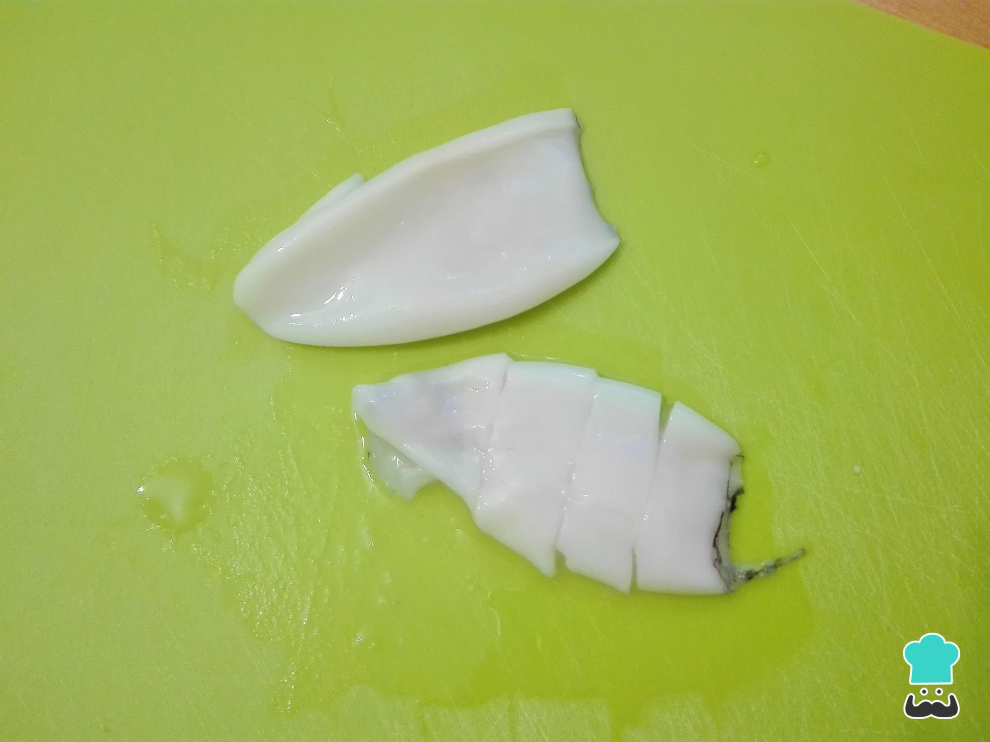 Para fazer esta receita de lula ao molho de tomate comece por cortar as lulas em anéis. À parte corte o tomate em pedaços sem as sementes, as cebolas em tiras e pique os alhos.