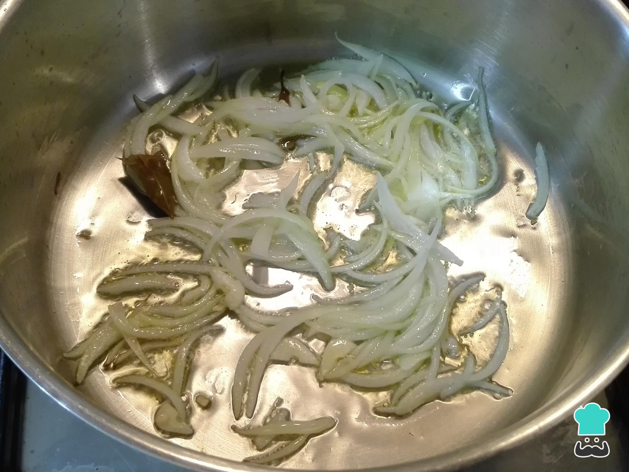 Em seguida leve ao fogo médio uma panela com o azeite, a cebola, os alhos e a folha de louro, e refogue até dourar ligeiramente.