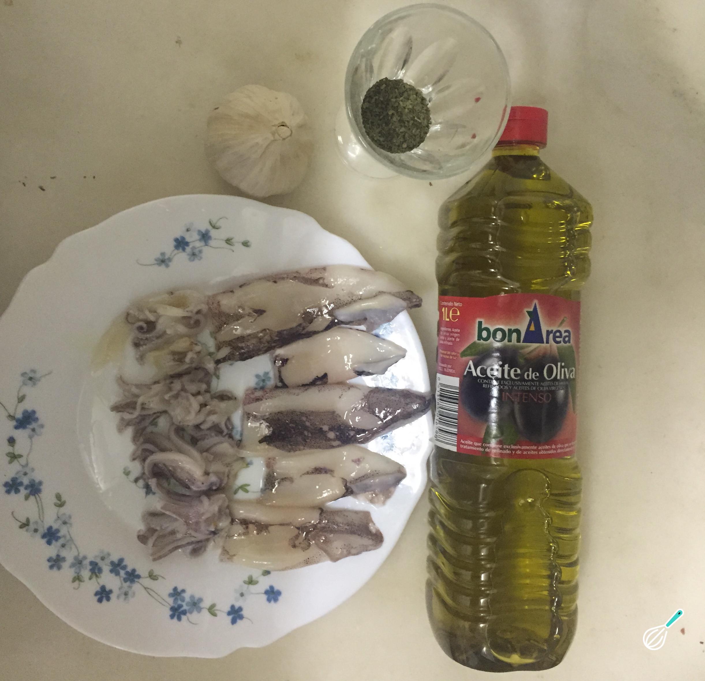Para fazer lulas fritas com alho, comece por reunir os ingredientes. Eu usei 5 lulas pequenas, uma pitada de salsinha seca (ou dois ramos se tiver fresca, que será ainda melhor), 2 dentes de alho e um pouco de óleo.