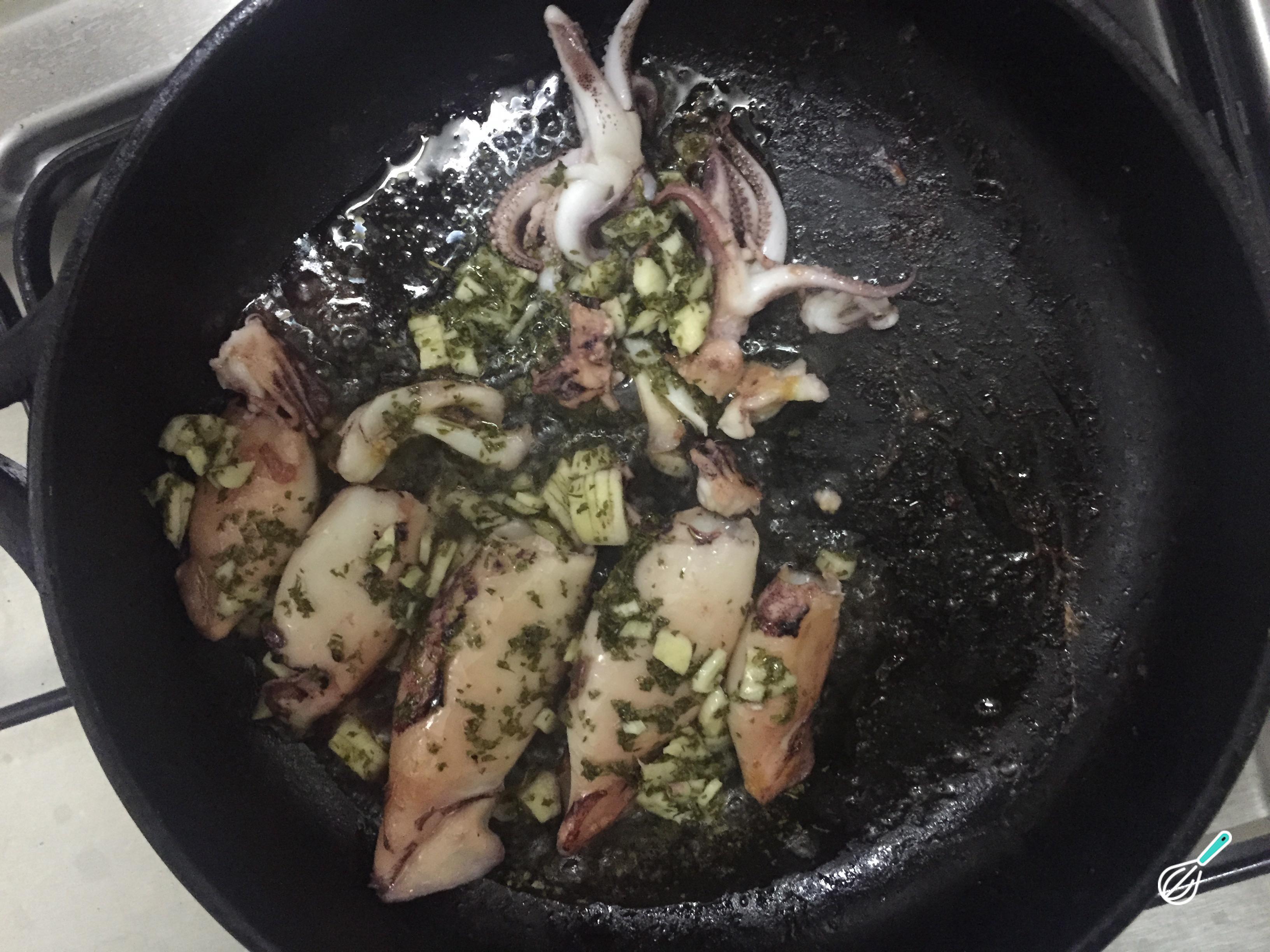 Assim que as lulas estiverem cozinhadas e começarem a dourar, adicione a preparação do alho, salsa e óleo da etapa anterior. Deixe tostar até o alho dourar. Uma vez dourado, estará pronto para servir.