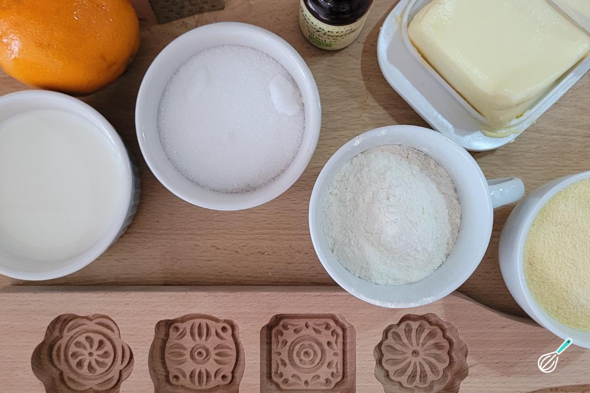 Separe os ingredientes para fazer seus maamoul. Normalmente se usa extrato de flor de laranjeira na massa, mas aqui fiz uma substituição por raspas de laranja.