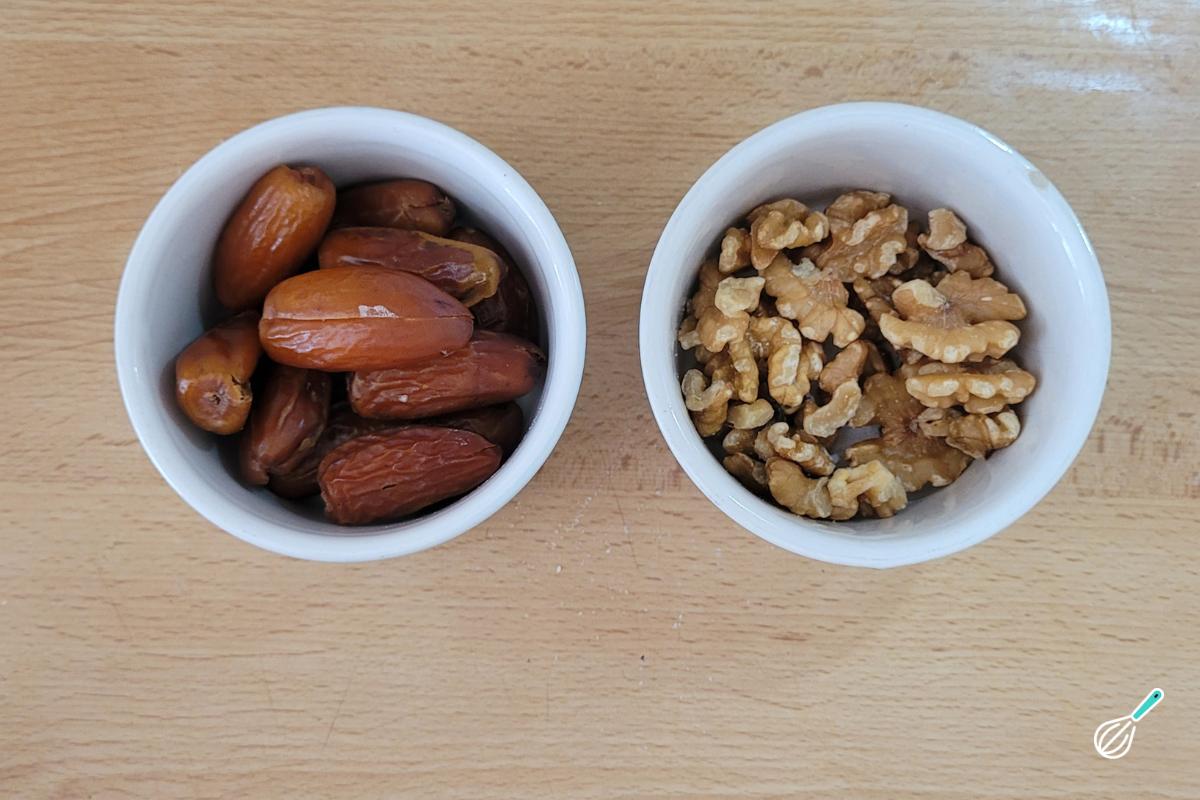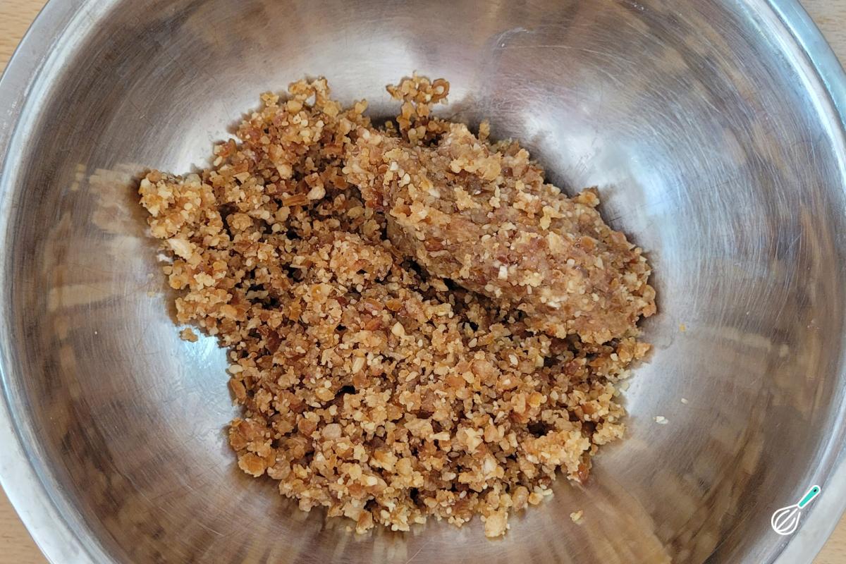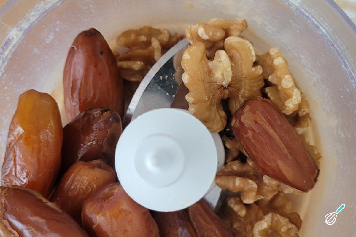 Bata as tâmaras e as nozes em um processador ou liquidificador até ter uma pastinha.