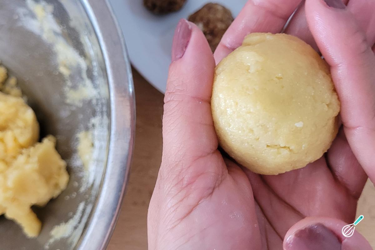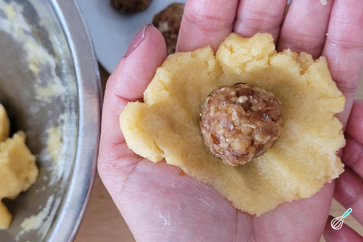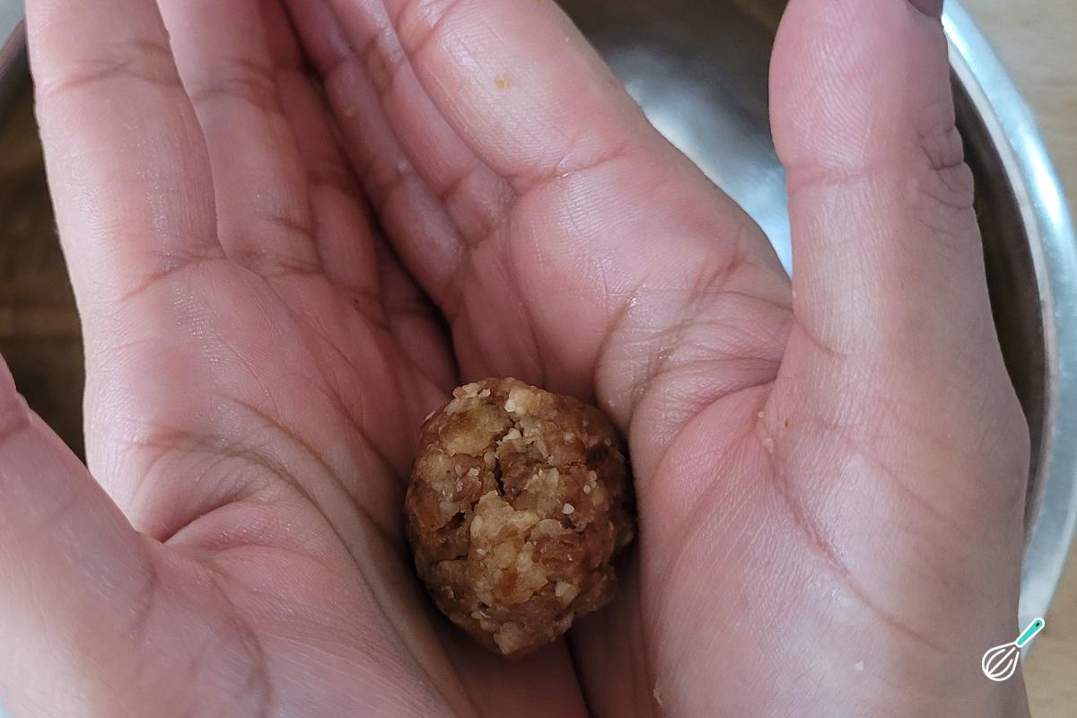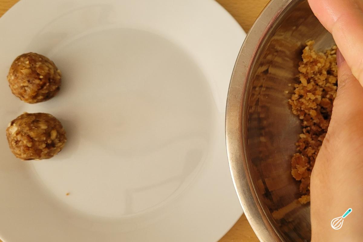 Vá pegando pequenas porções da massa de tâmaras e nozes e formando bolinhas com as mãos. Assim ficará mais fácil para rechear a massa.
