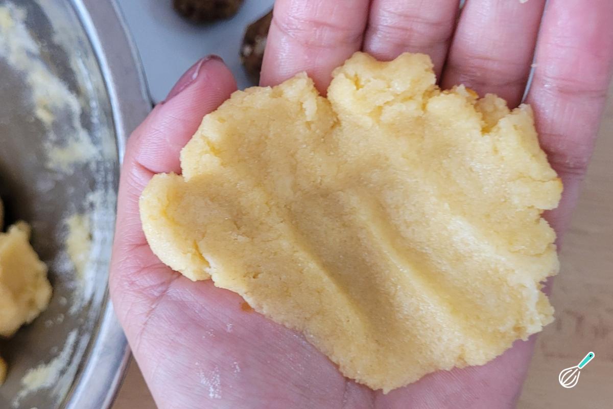 Agora pegue pequenas porções da massa reservada e abra sobre a palma da mão.