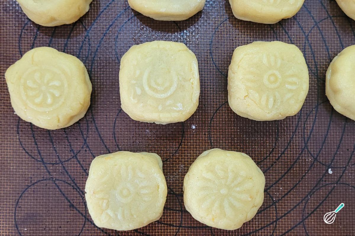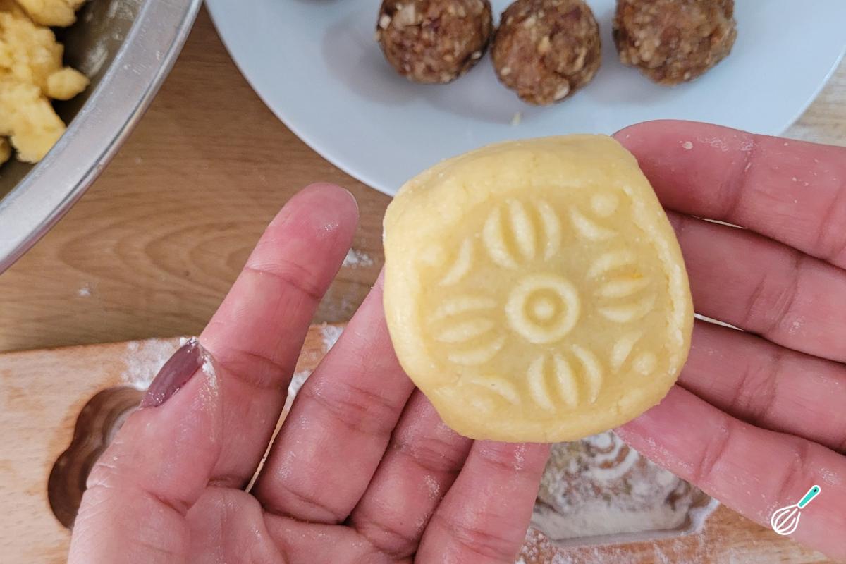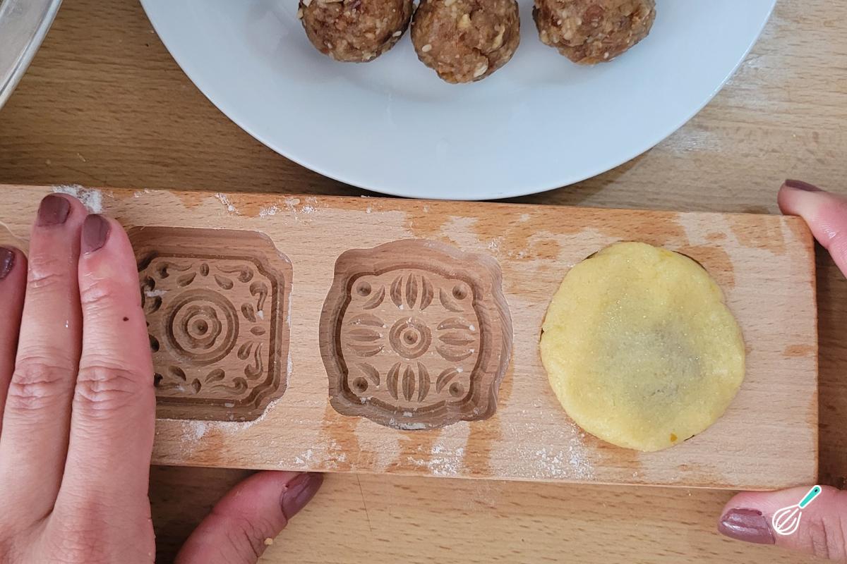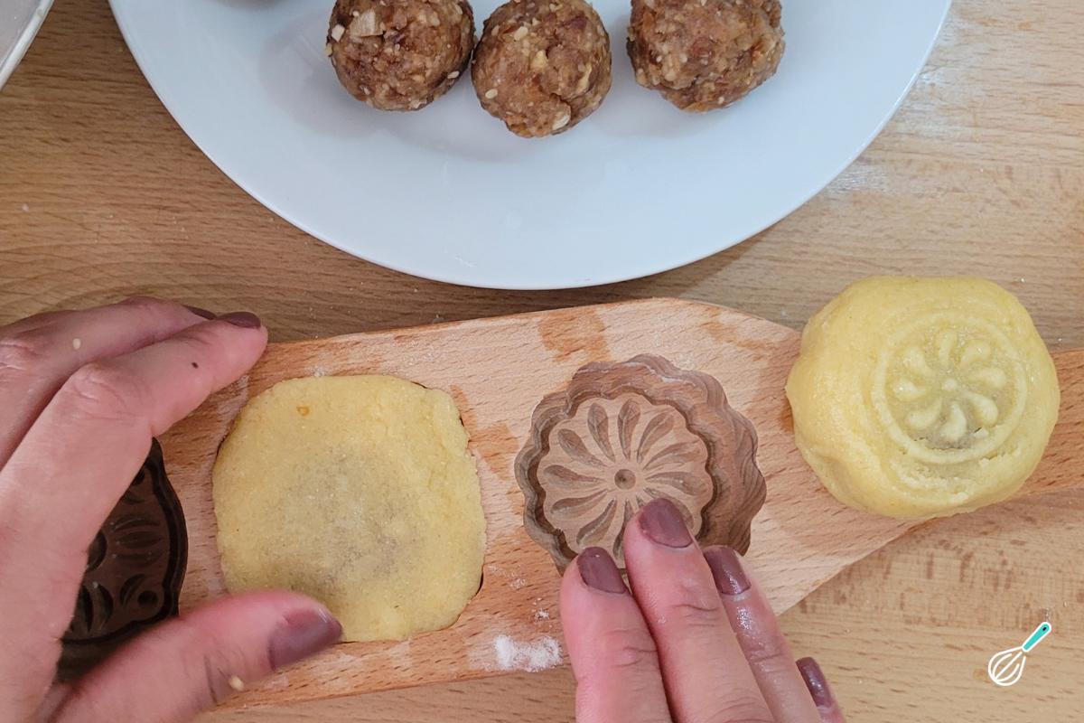 Os maamoul geralmente são decorados pressionando sobre um molde de madeira com impressões.