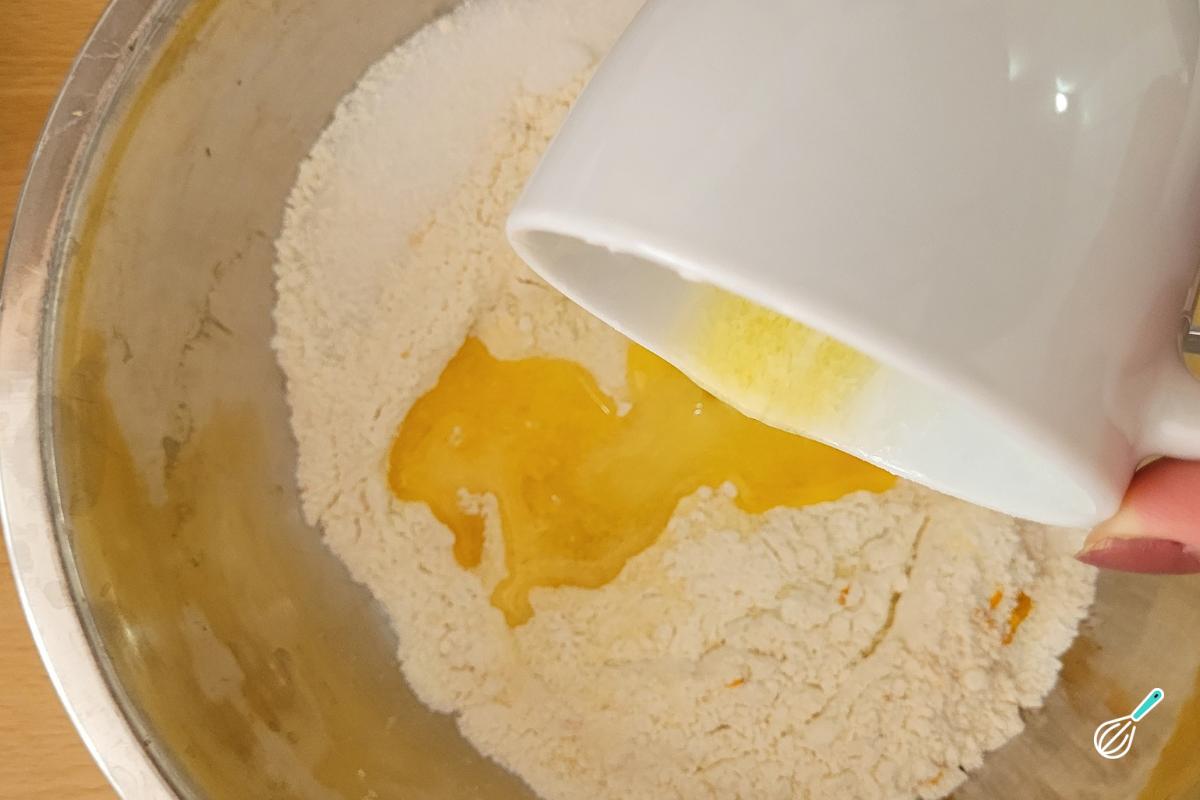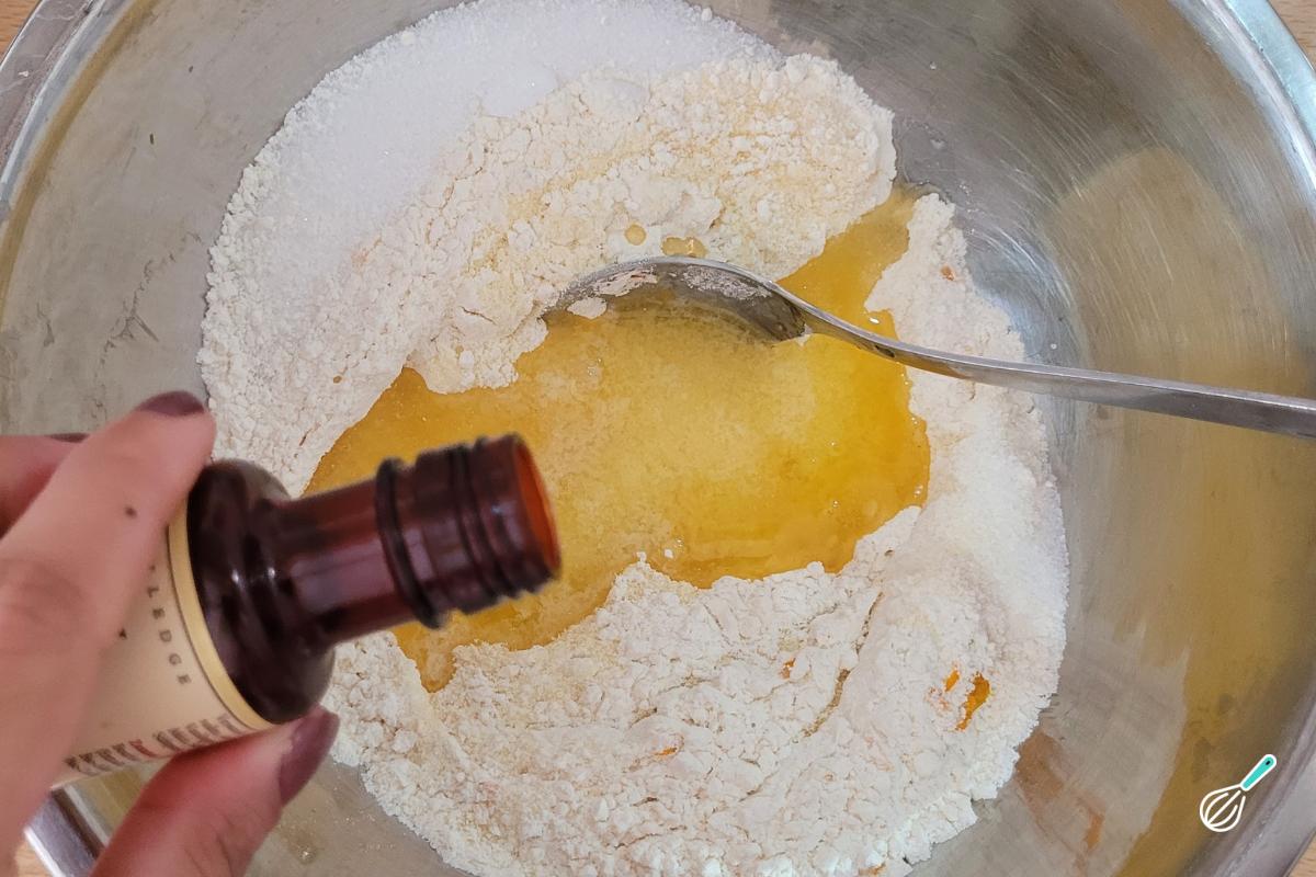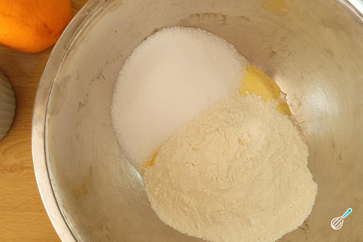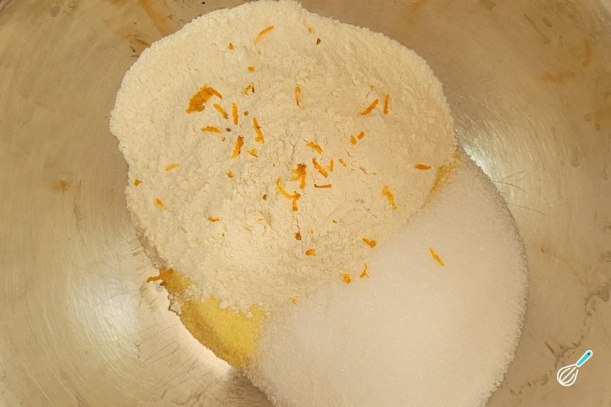Em uma tigela, misture os ingredientes secos: semolina, farinha, açúcar e a pitada de sal.