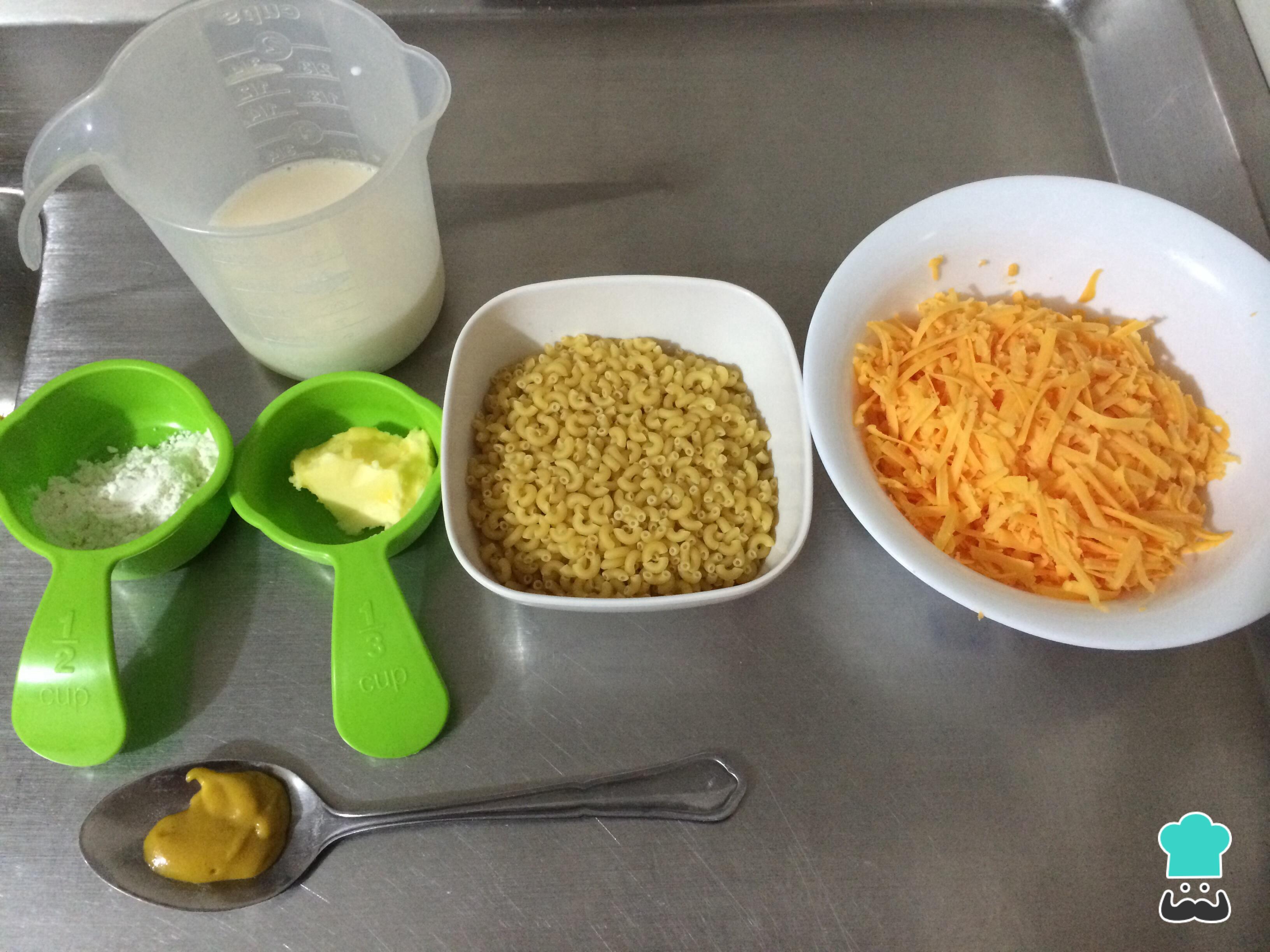 Para preparar esta receita de macarrão e queijo, o primeiro passo é reunir todos os ingredientes. Neste caso usei queijo cheddar, porém você pode usar outro da sua preferência ou até misturar outro, o importante é que derretam no forno.