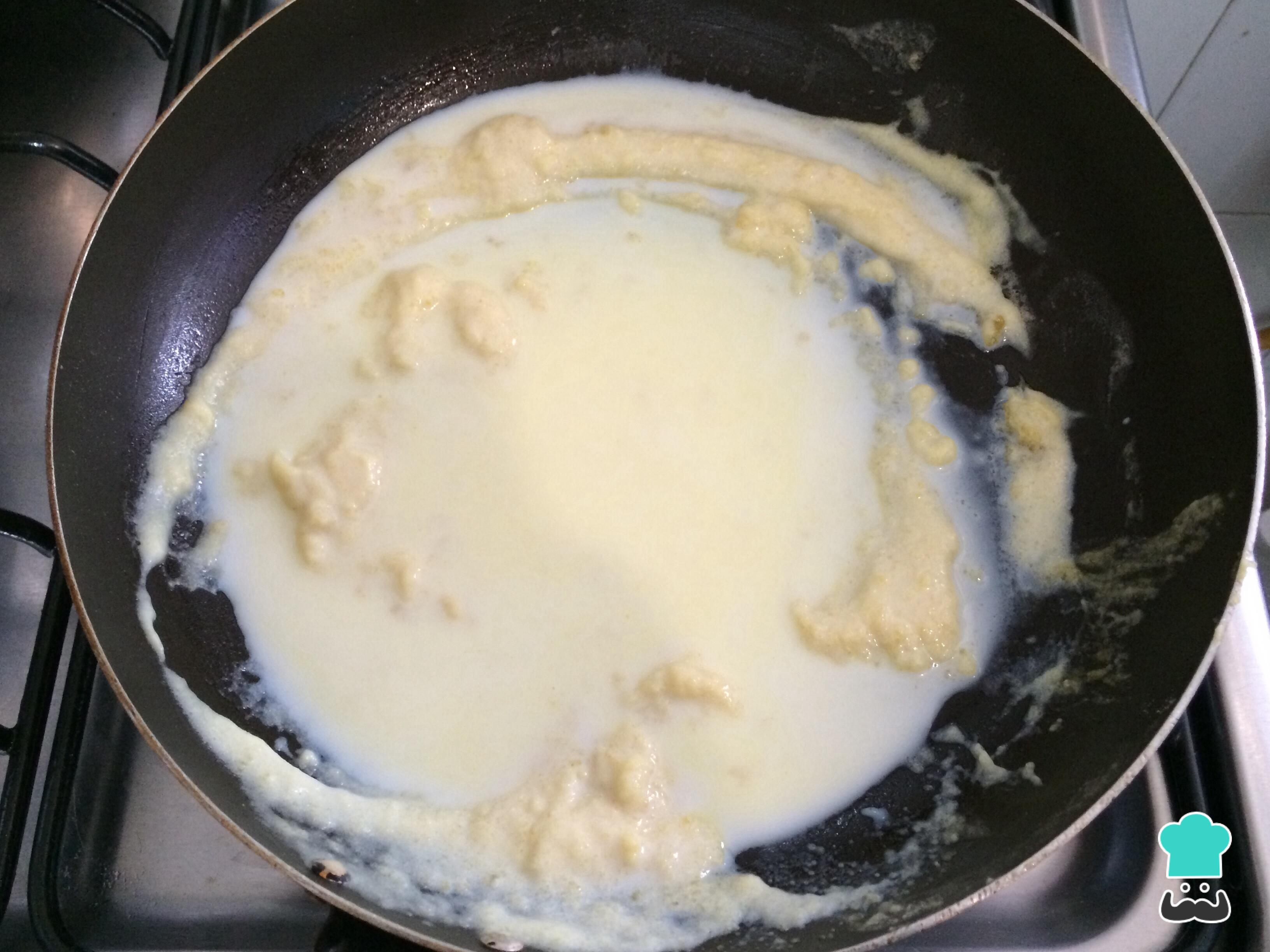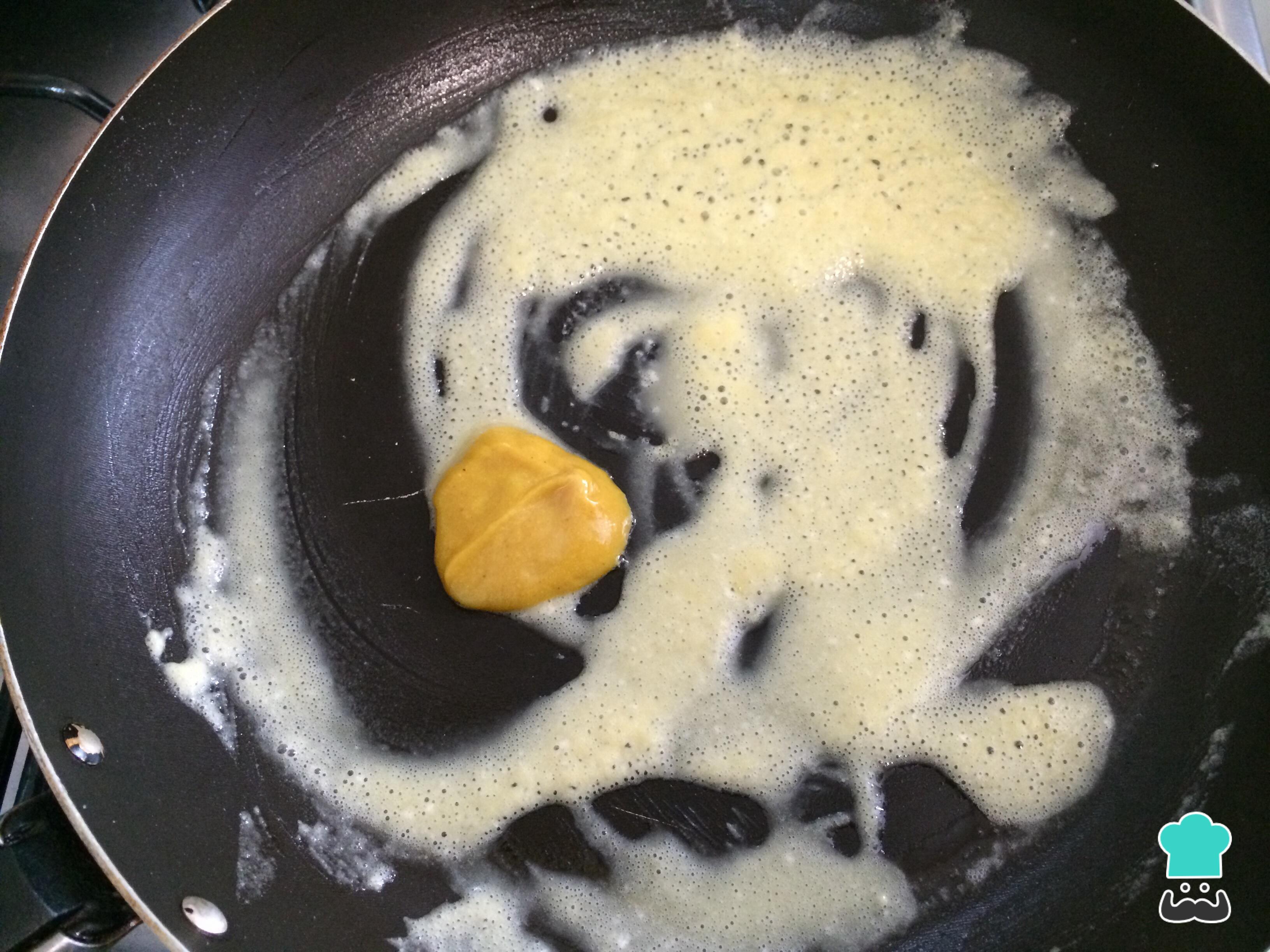 Em uma panela derreta a manteiga, adicione a farinha e cozinhe em fogo baixo por 3 minutos, mexendo sempre. Após esse tempo adicione a mostarda e misture.