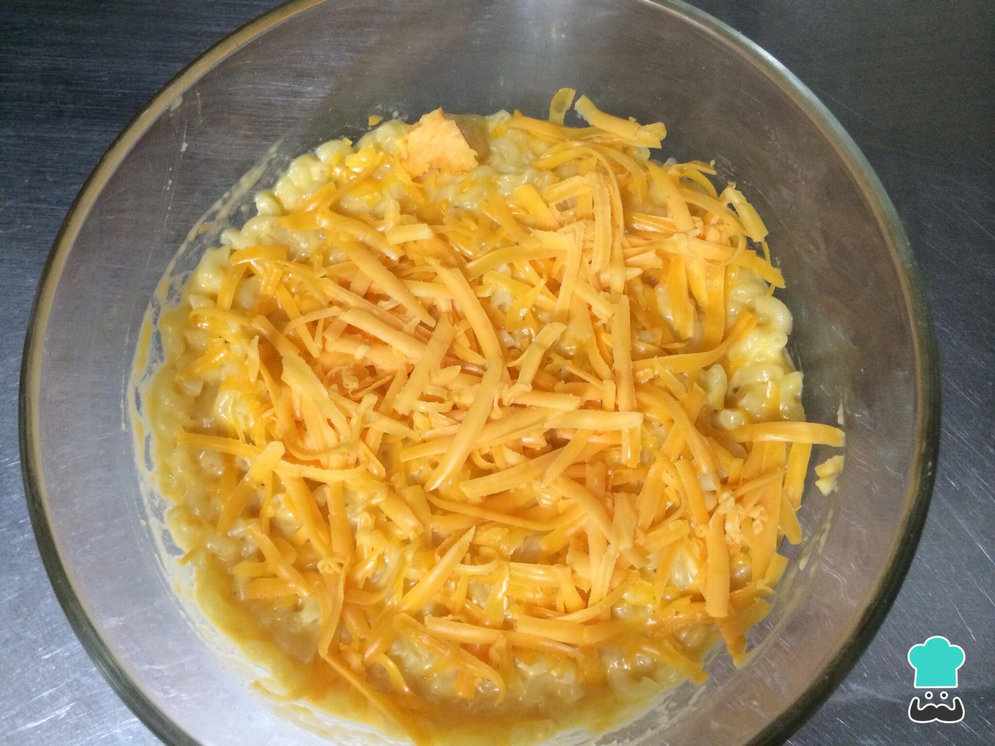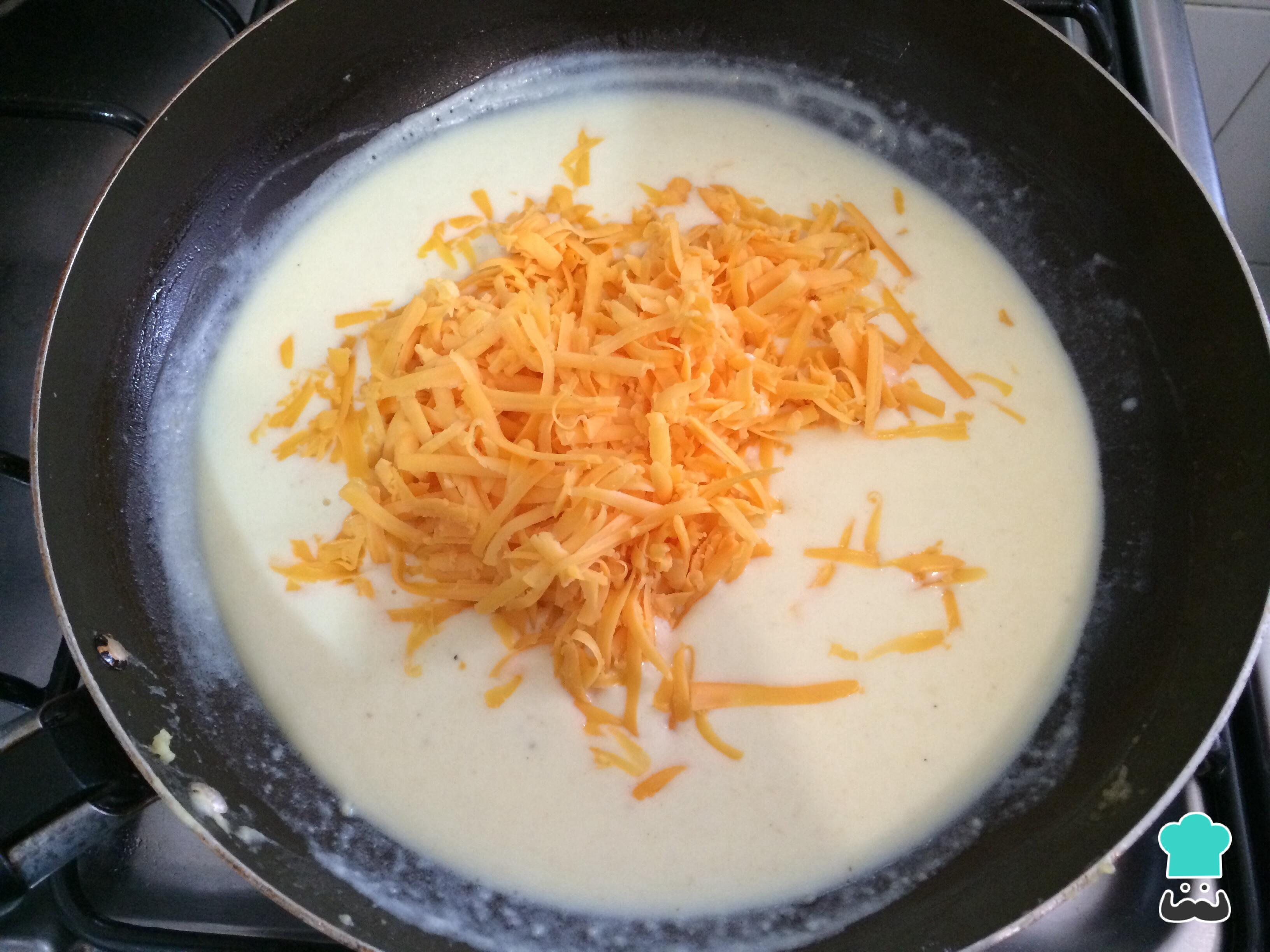 Finalmente, adicione o queijo cheddar (reserve um pouco para gratinar) e misture até que o queijo derreta e se incorpore completamente no molho.
