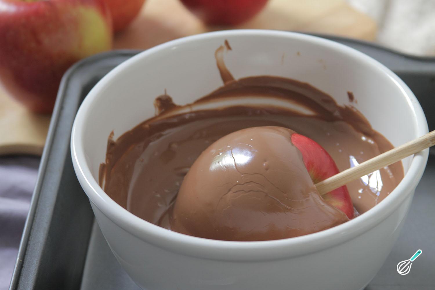 Em seguida derreta o chocolate em banho maria (ou microondas) e reserve até amornar. Assim que o chocolate ficar morno, pegue um palito de picolé e molhe a ponta no chocolate. Pegue uma maçã e enfie o palito molhado de chocolate na parte de baixo da maçã (na parte onde não tem caule).