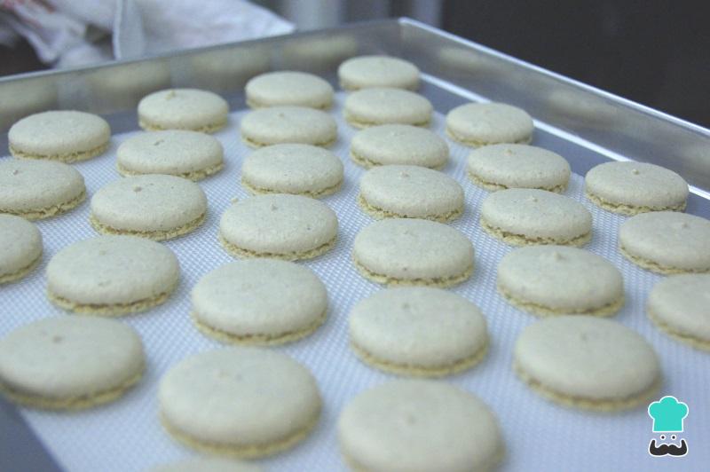 Asse por 10 minutos no forno a 100 º C e, de seguida, aumente a temperatura para 130 º C. Asse por mais 10 minutos, retire do forno e deixe esfriar na assadeira (cerca de 10 minutos). De seguida, remova o macaron de amendoim da assadeira e reserve.