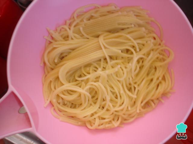 Cozinhe o macarrão numa panela com a água, a manteiga e o sal até ficar al dente. Depois escorra e reserve.