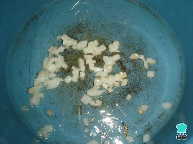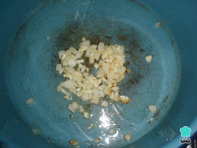 Quando a cebola começar a dourar, acrescente o alho, também cortado finamente, e refogue por mais 1 minuto.