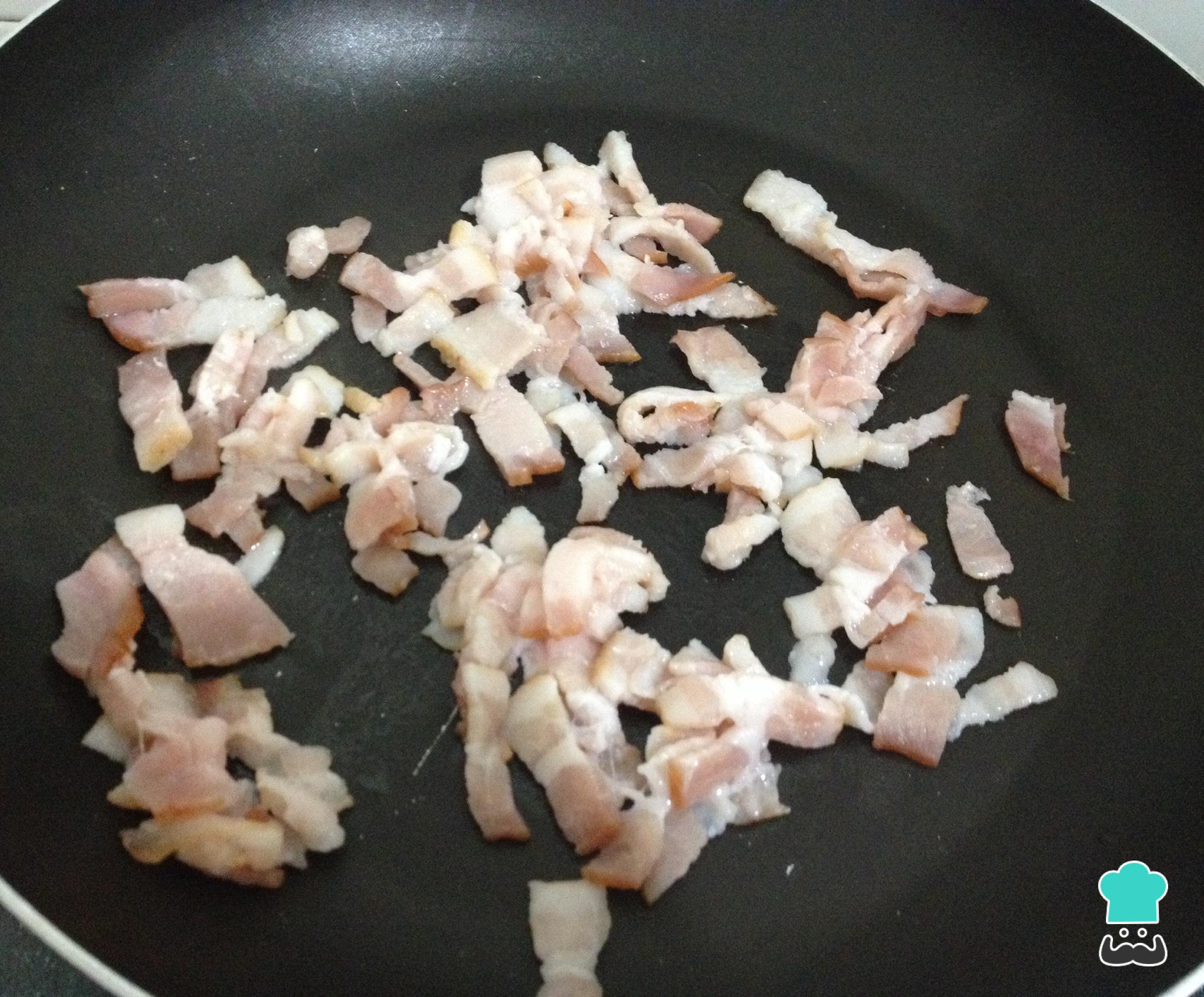 Corte o bacon em tiras finas. Coloque em uma frigideira e cozinhe até que comece libertando a gordura e fique dourado.