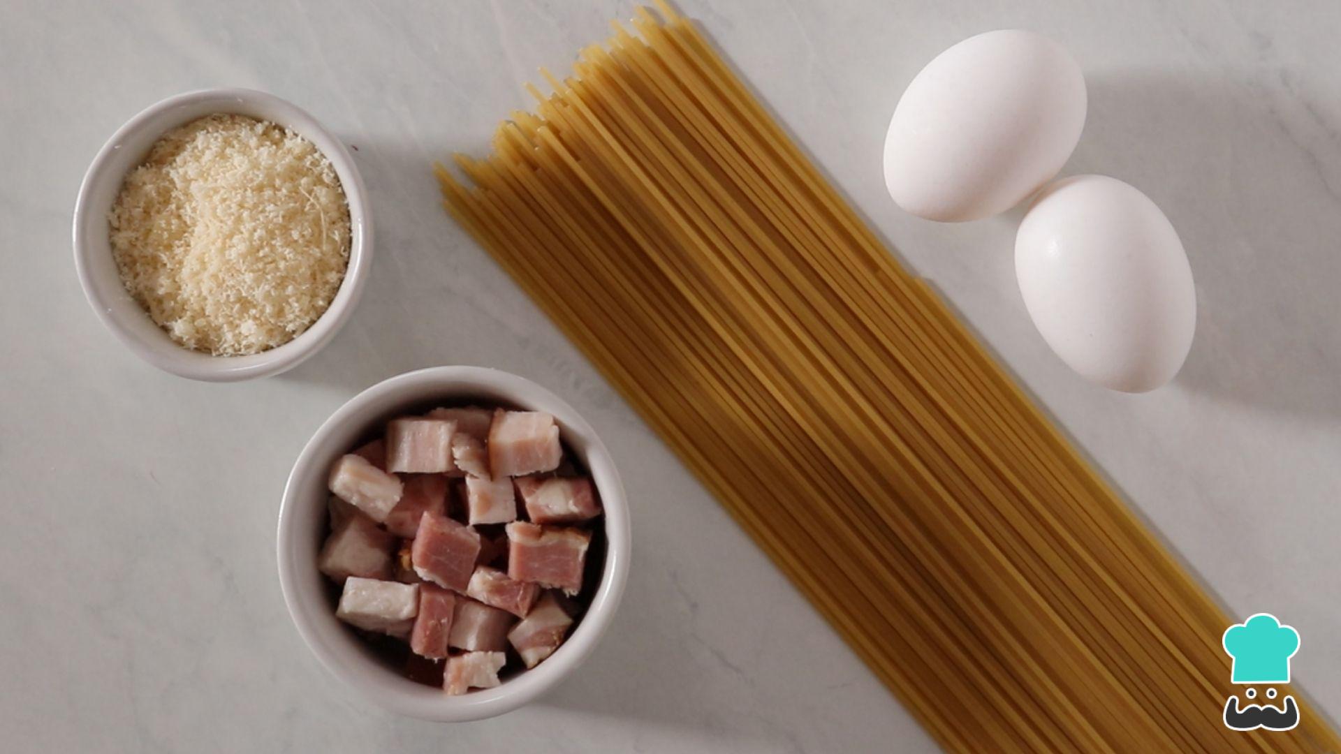 Separe os ingredientes. Rale o queijo parmesão e corte o bacon em cubos. Essa é uma receita individual.
