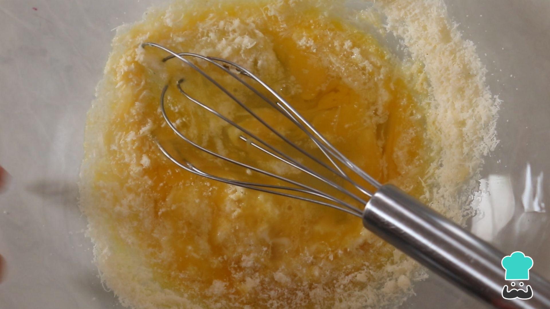 Comece batendo os ovos com o parmesão ralado. Reserve.