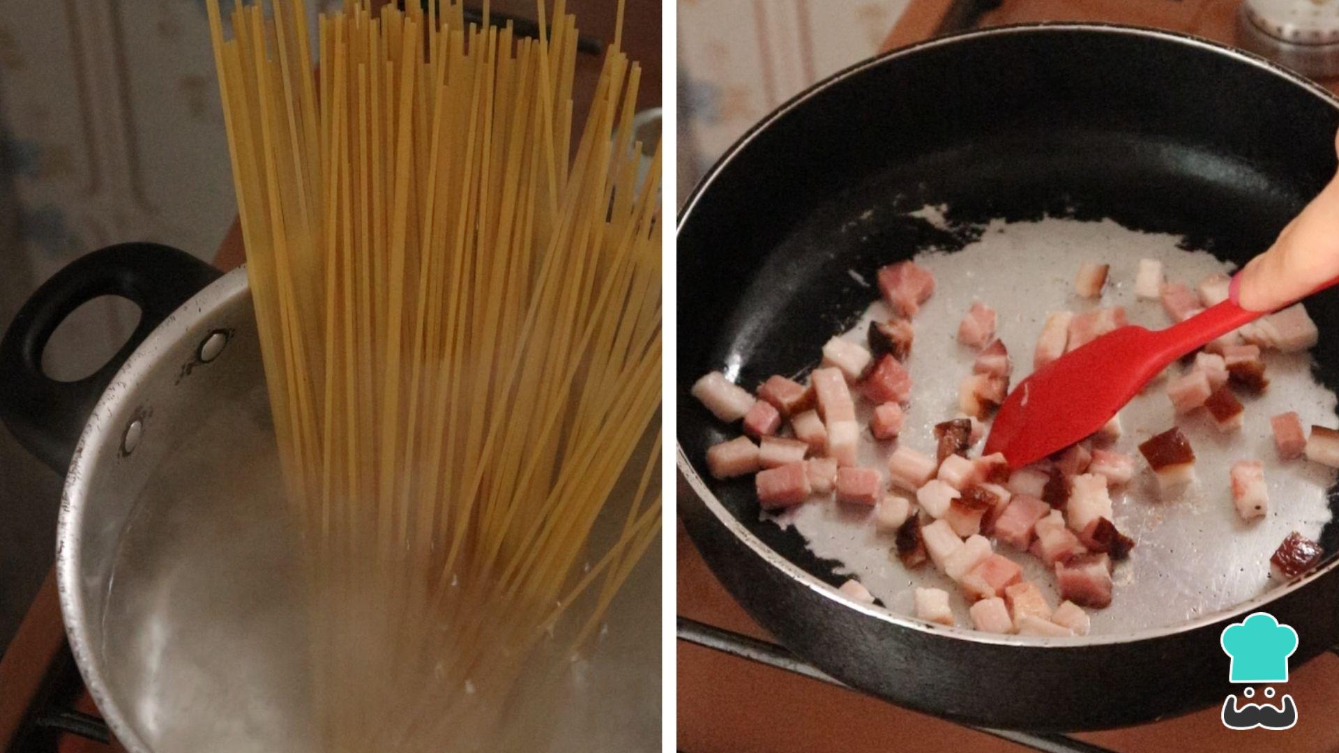 Essa é uma receita super rápida e que permite fazer os preparos paralelamente. Por isso, enquanto você cozinha o macarrão de acordo com as instruções da embalagem e com um pouco de sal, frite os cubos de bacon em uma frigideira. Quando terminar, desligue o fogo.