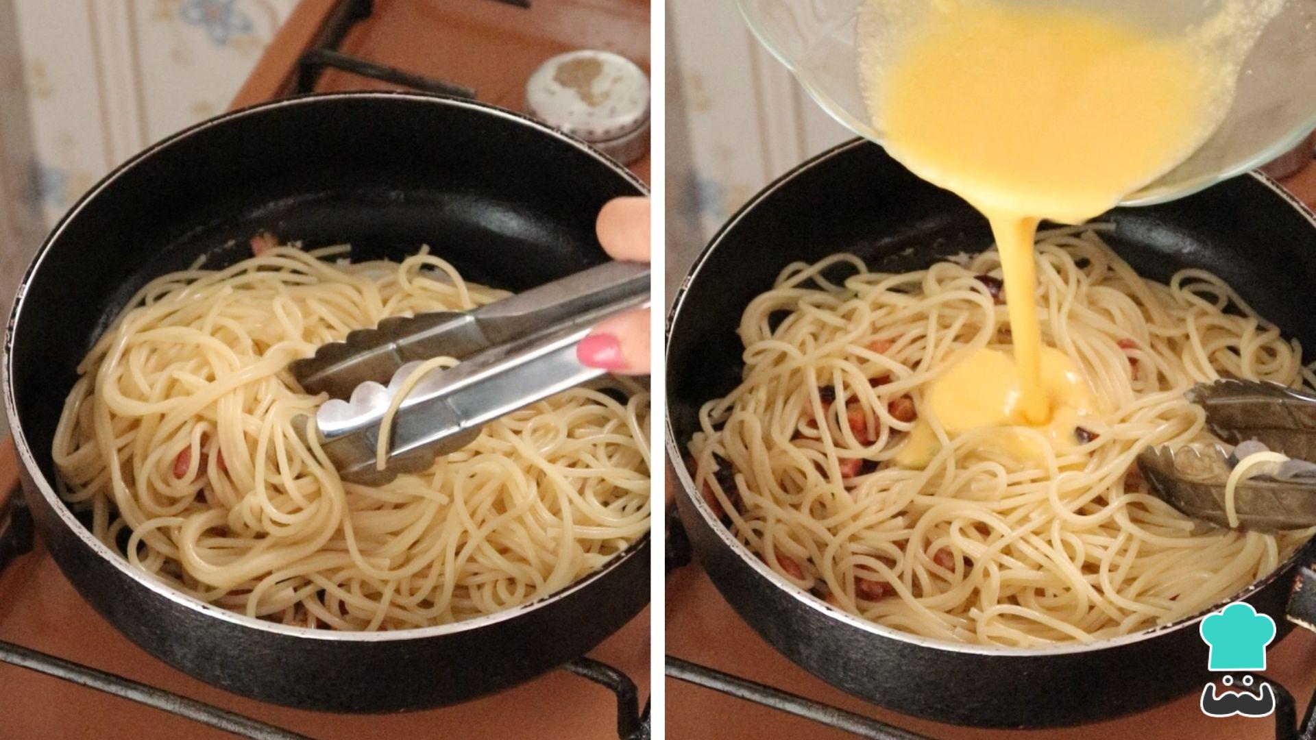 Dica: Esse passo tem que ser bem rápido já que o ovo cozinhará apenas com o calor da massa. Não cozinhe demais - a ideia é que o macarrão fique cremoso e suculento com a adição dos ovos!