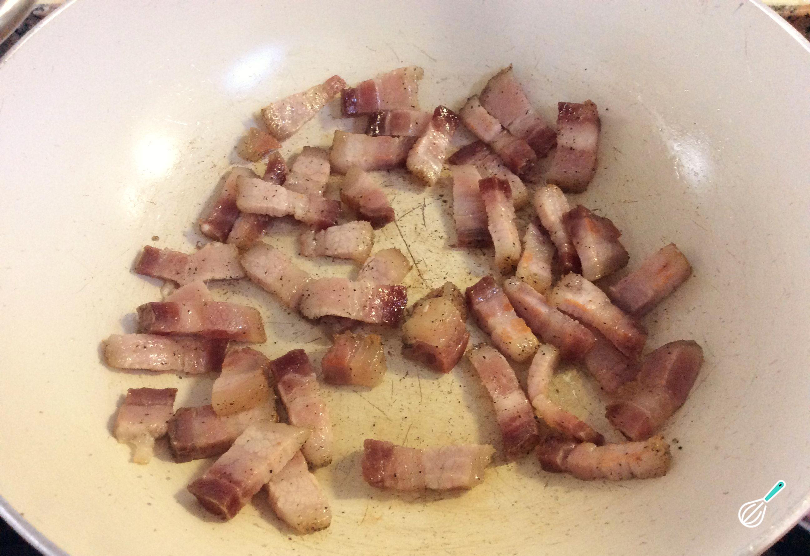 Frite o guanciale ou bacon em uma frigideira para começar a cozinhar o molho do macarrão. Não usamos óleo, já que o bacon soltará gordura.