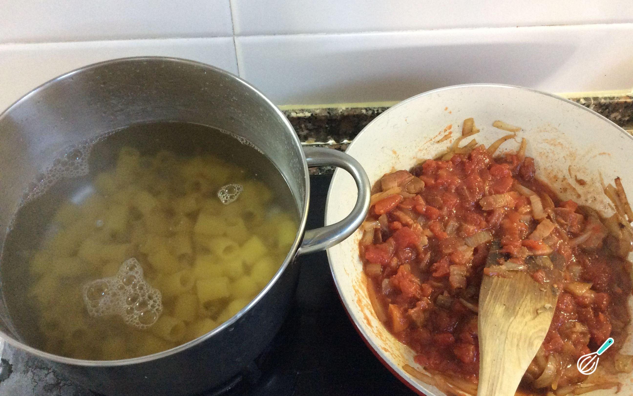 Em uma panela coloque o macarrão em água fervente com sal, e ao mesmo tempo, adicione o molho de tomate à cebola e bacon.