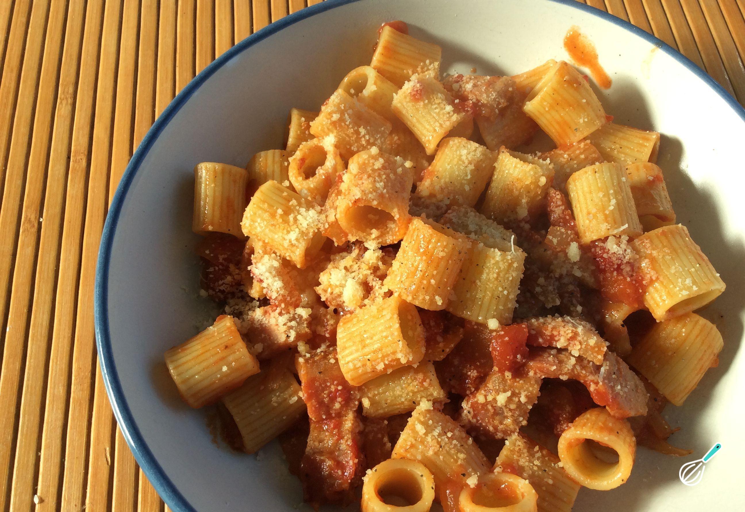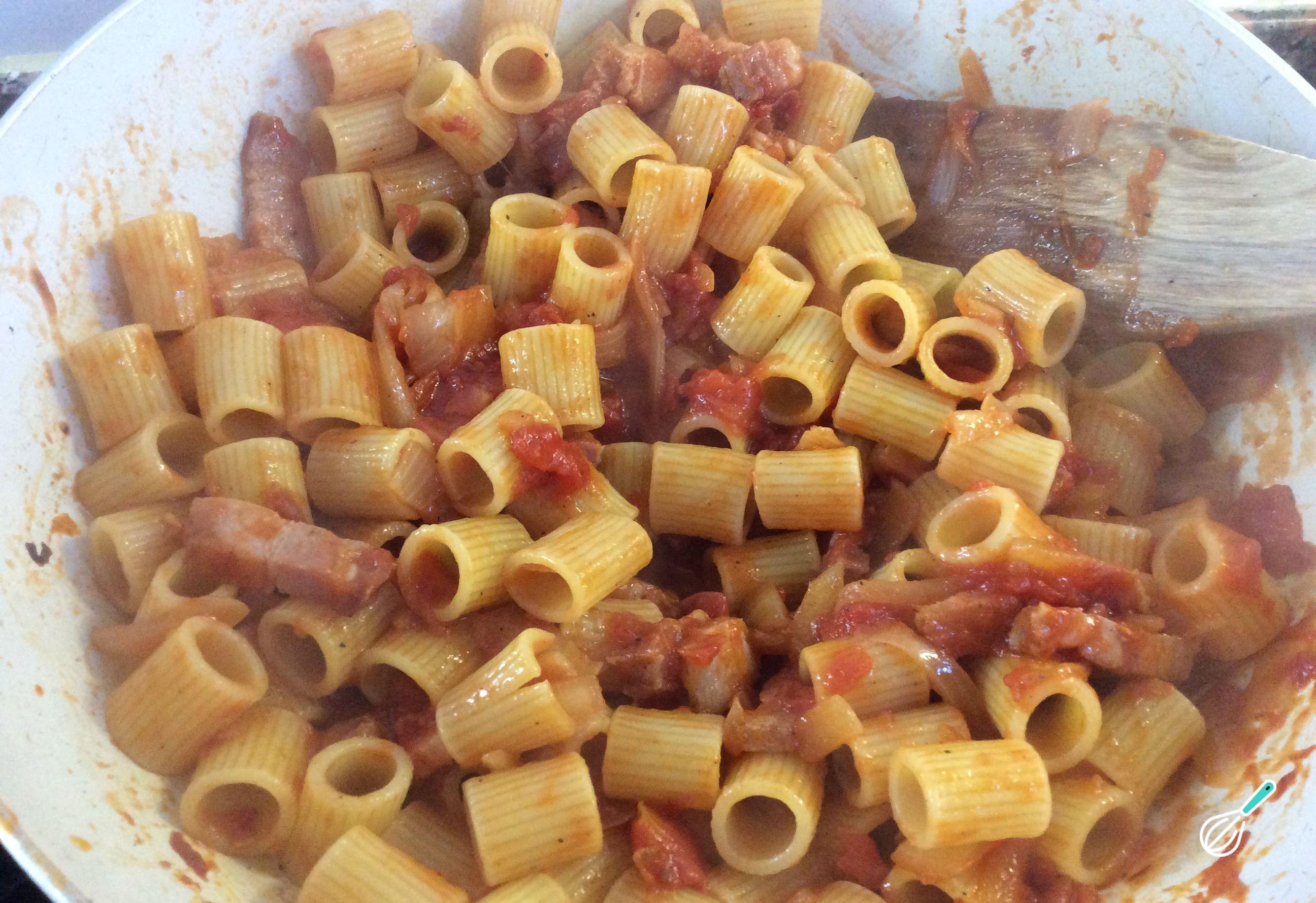 Após ter passado o tempo de cozedura do macarrão, o excesso de suco do molho de tomate já terá evaporado. Quando o macarrão estiver cozido, escorra-o e adicione-o à frigideira, ainda no fogo, enquanto mistura. E esta receita italiana para macarrão com tomate e bacon já está pronta!