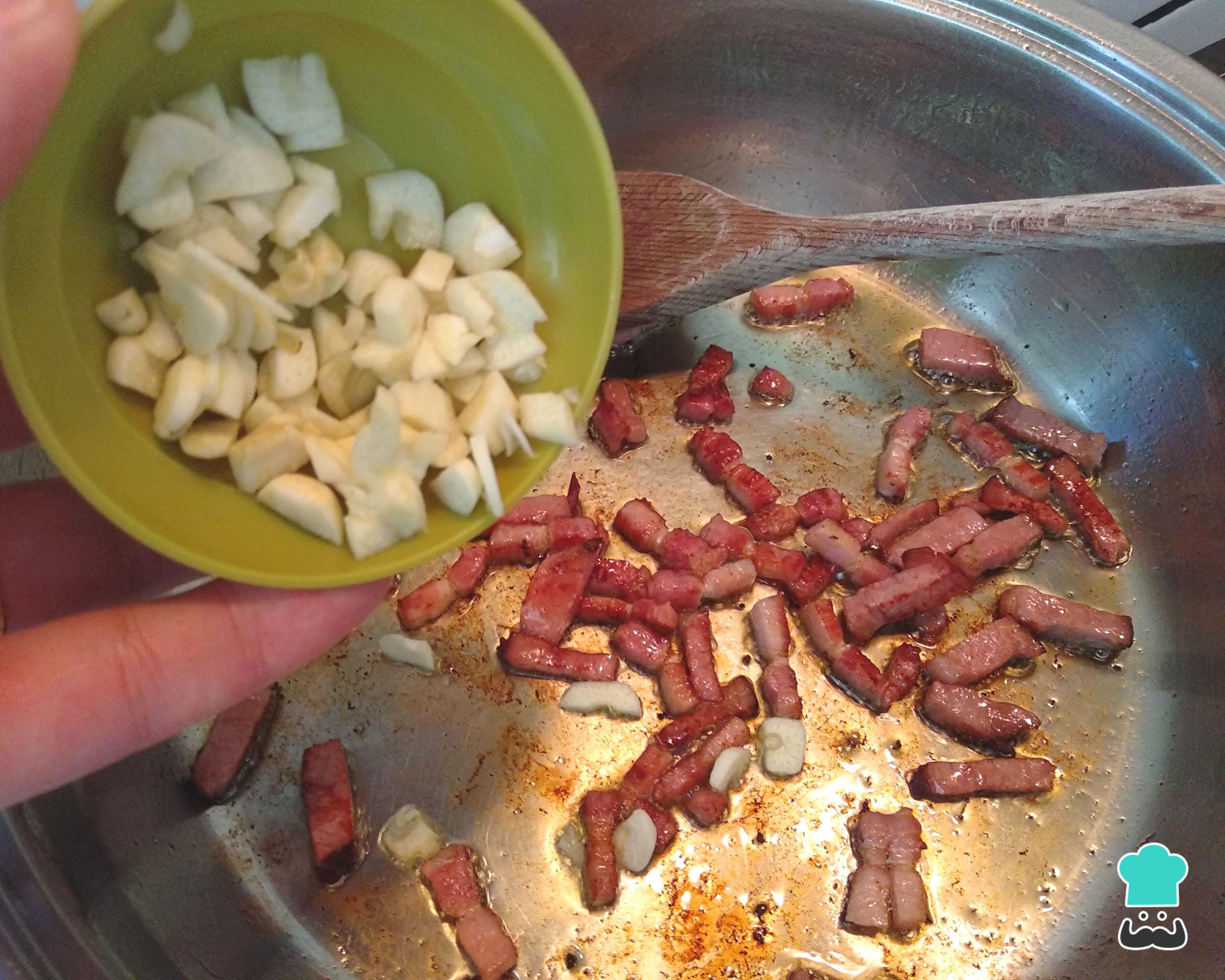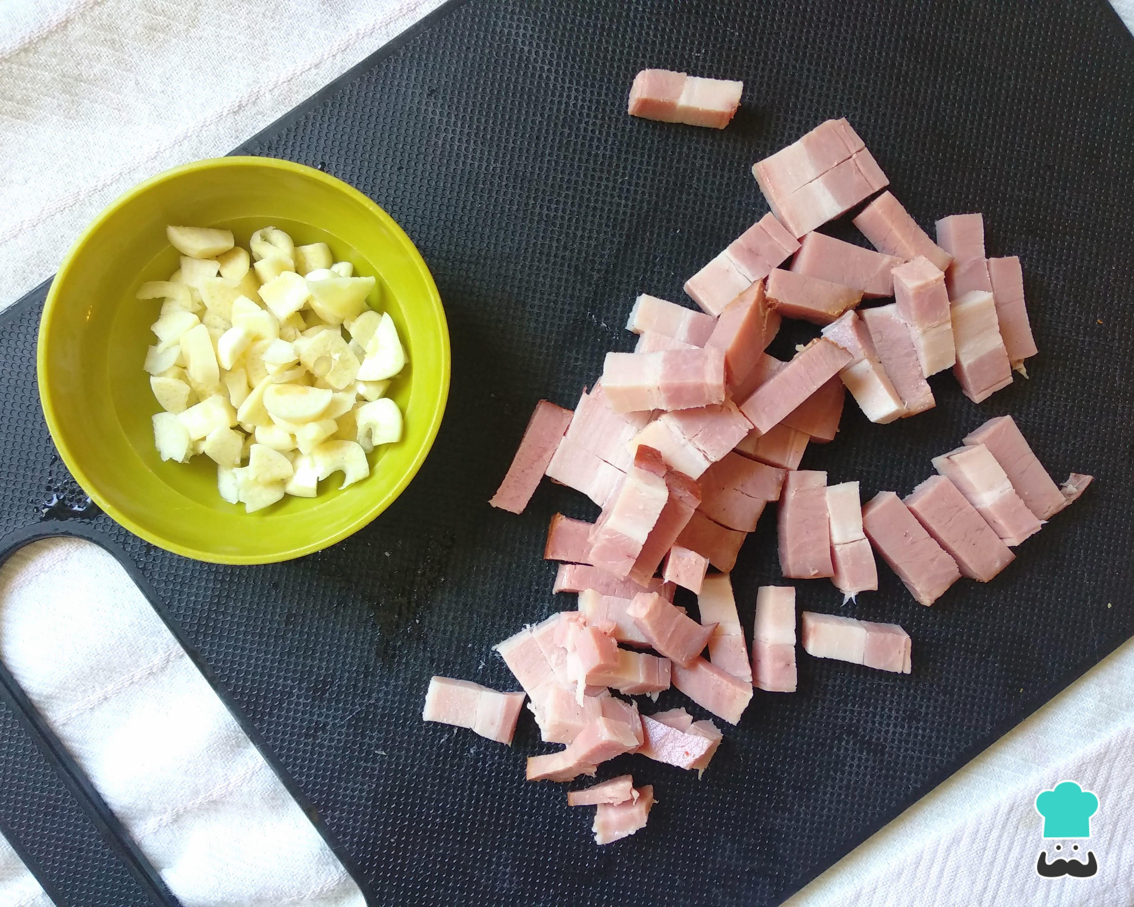 Enquanto isso, descasque e pique os alhos em pedacinhos. Pique também o bacon do jeito que preferir.