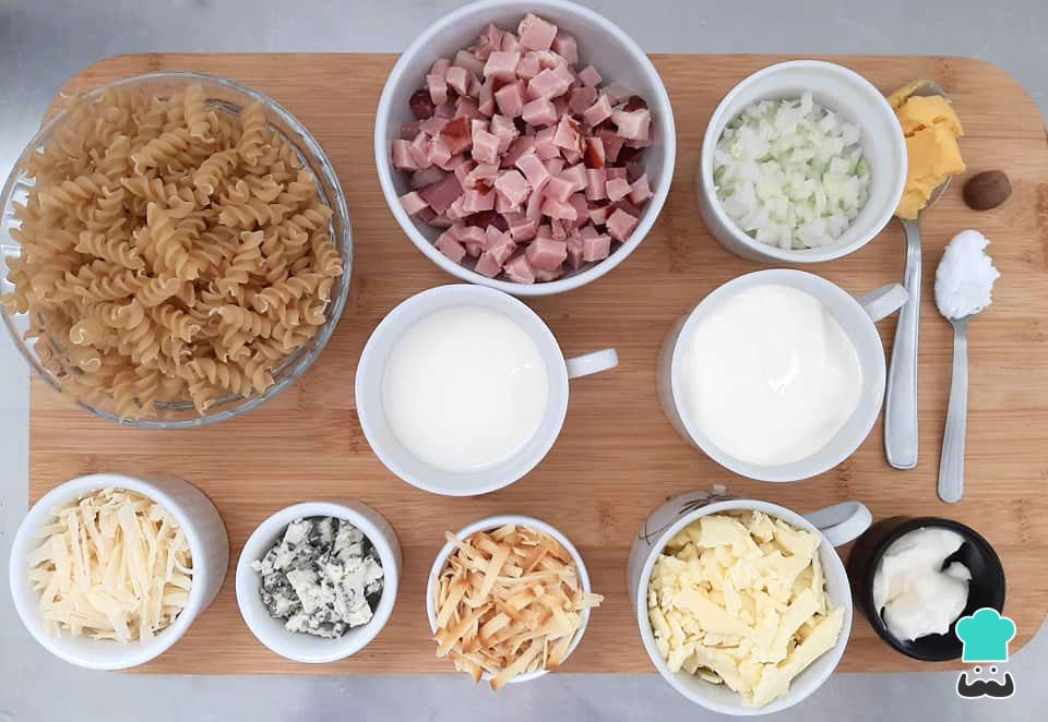 Comece separando todos os ingredientes necessários para preparar o seu macarrão ao molho 4 queijos com bacon.