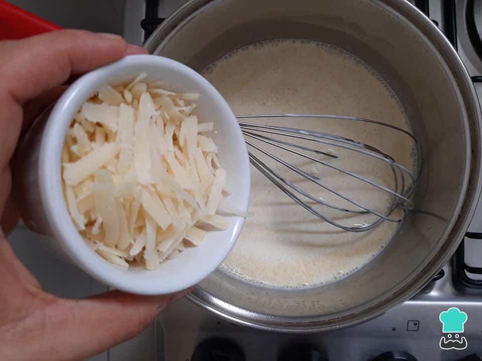 Adicione o creme de leite e misture, sem deixá-lo ferver. Acrescente o queijo parmesão ralado e misture bem.