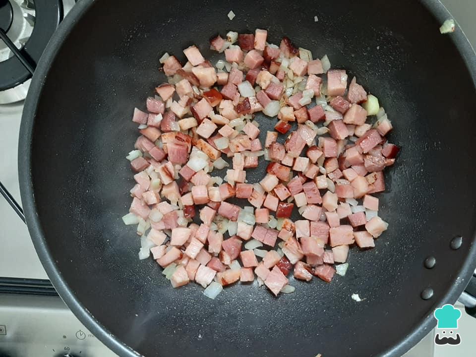 Numa frigideira no fogo médio-baixo acrescente o bacon em cubinhos e deixe-o refogando na própria gordura. Em seguida, junte a cebola picada, misture e deixe até tudo estar bem refogado e dourado levemente.