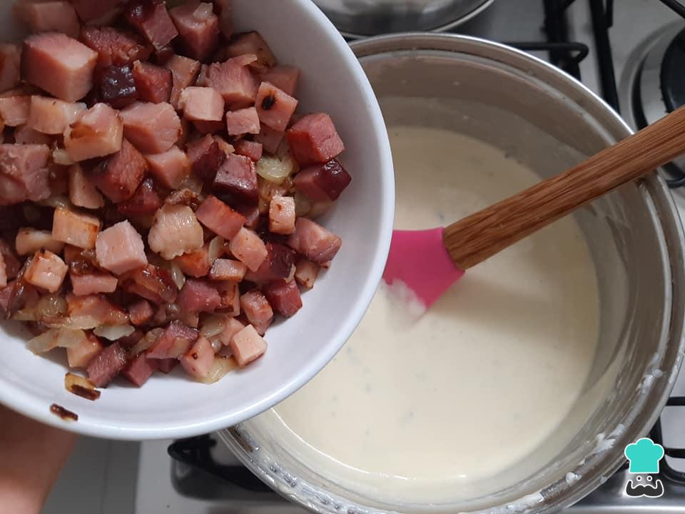 Escorra o excesso de gordura do bacon (se houver) e junte ao molho 4 queijos preparado anteriormente. Misture tudo e reserve o molho.