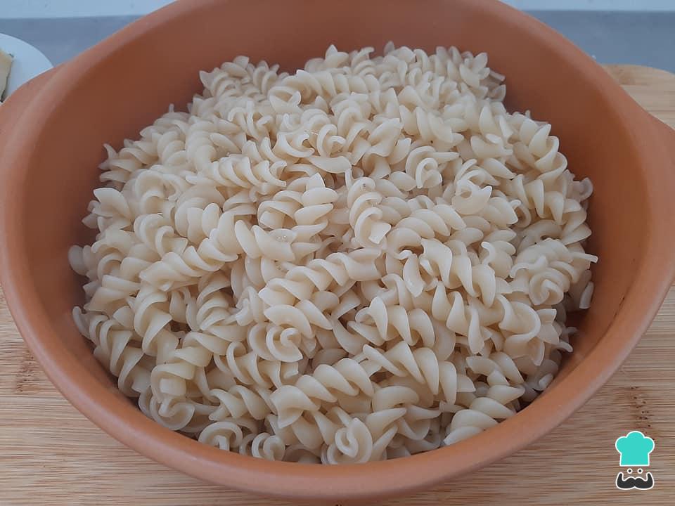 Escorra o macarrão e, em seguida, coloque-o na travessa ou no refratário em que vai servir esta receita de macarrão com molho de queijo e bacon.