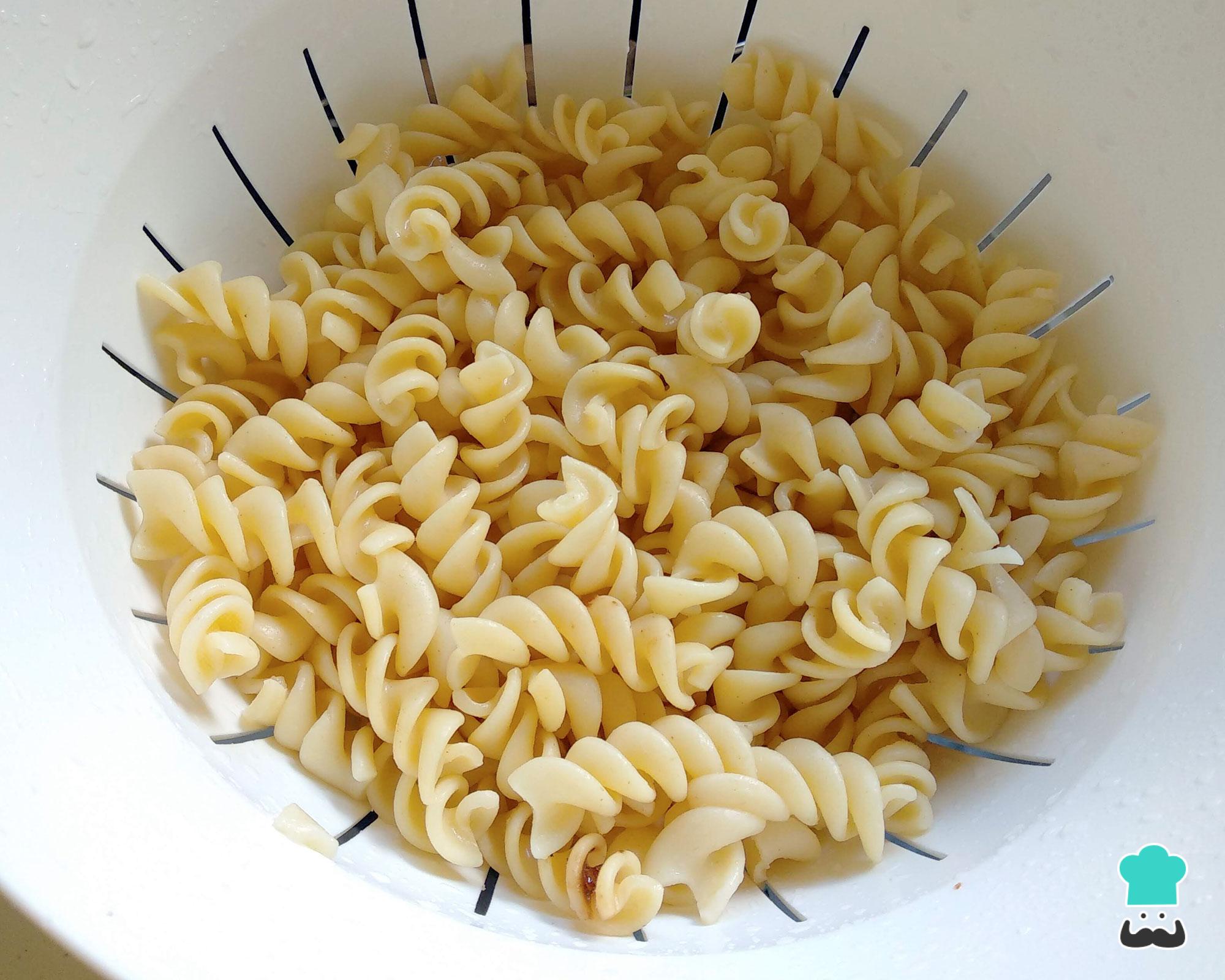 Primeiro cozinhe o macarrão de acordo com as indicações na embalagem. Escorra, passe por água fria (para parar o cozimento) e reserve.