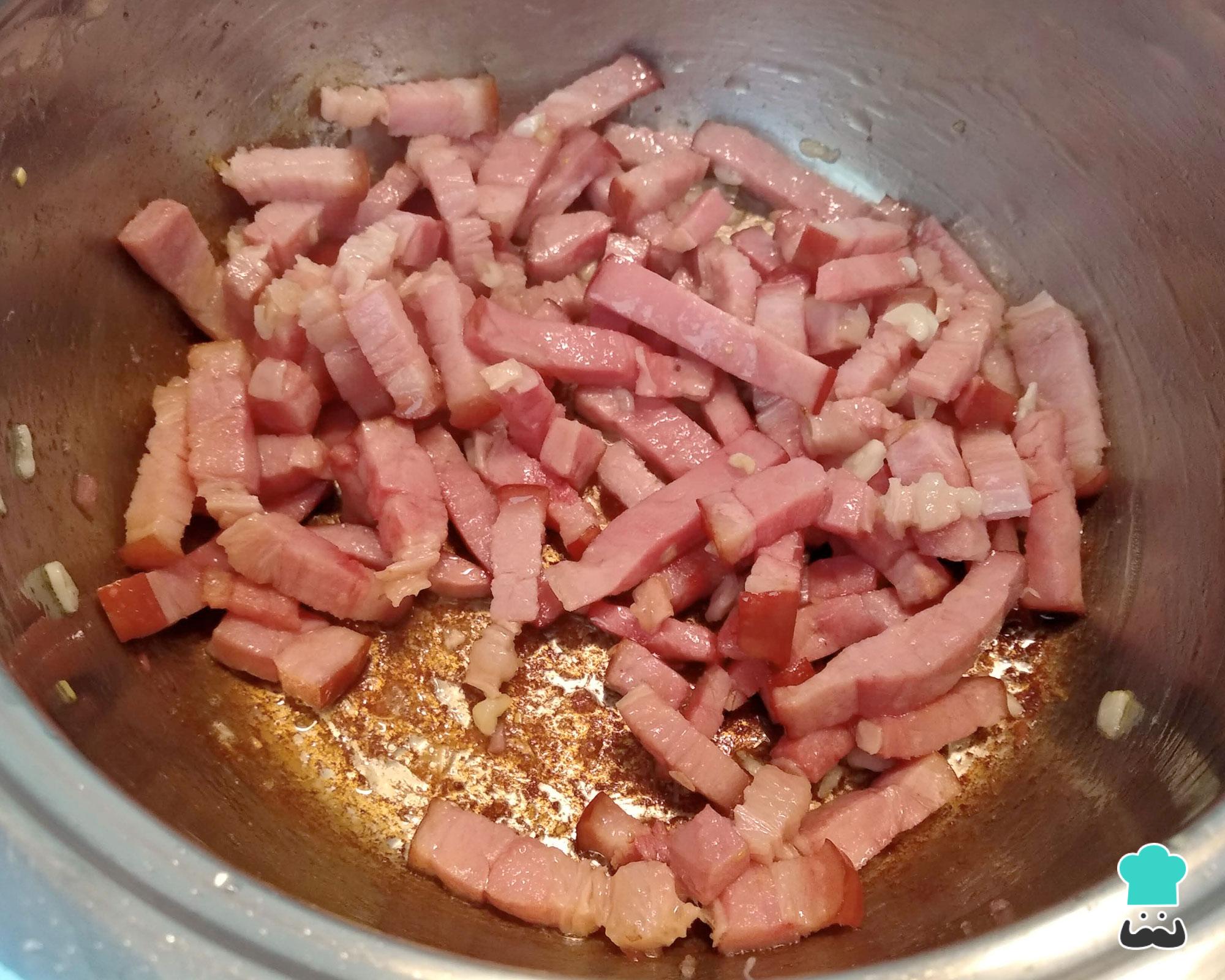 Dica: Frite bem o bacon para ele soltar a sua gordura e sabor. Não se preocupe se o fundo da panela ficar escurinho, como na foto, pois isso acrescentará mais sabor no prato!