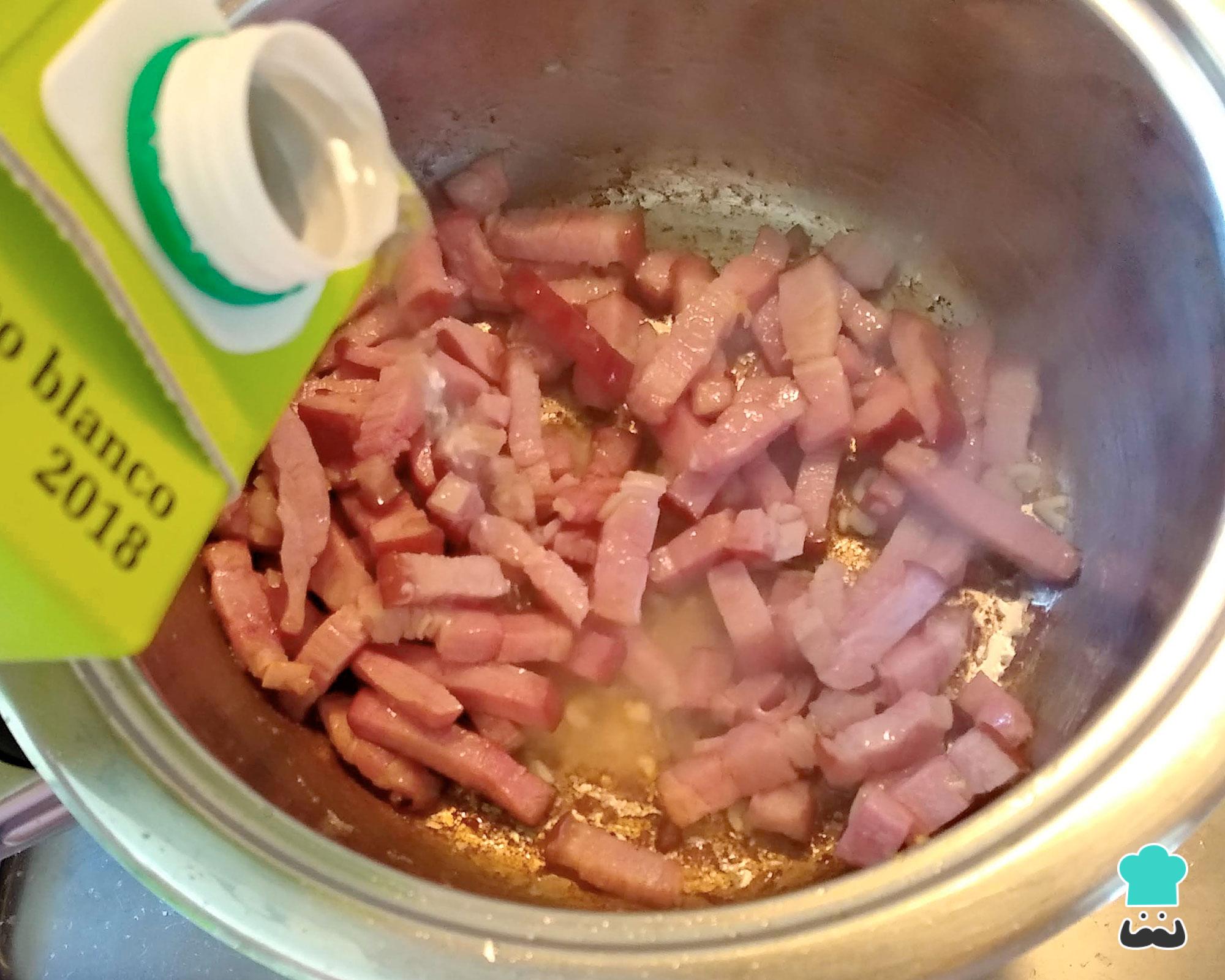 Para soltar os pedacinhos de bacon e alho grudados na panela, adicione o vinho branco. Deixe ferver por 1-2 minutos, para eliminar o álcool e realçar o sabor do bacon.