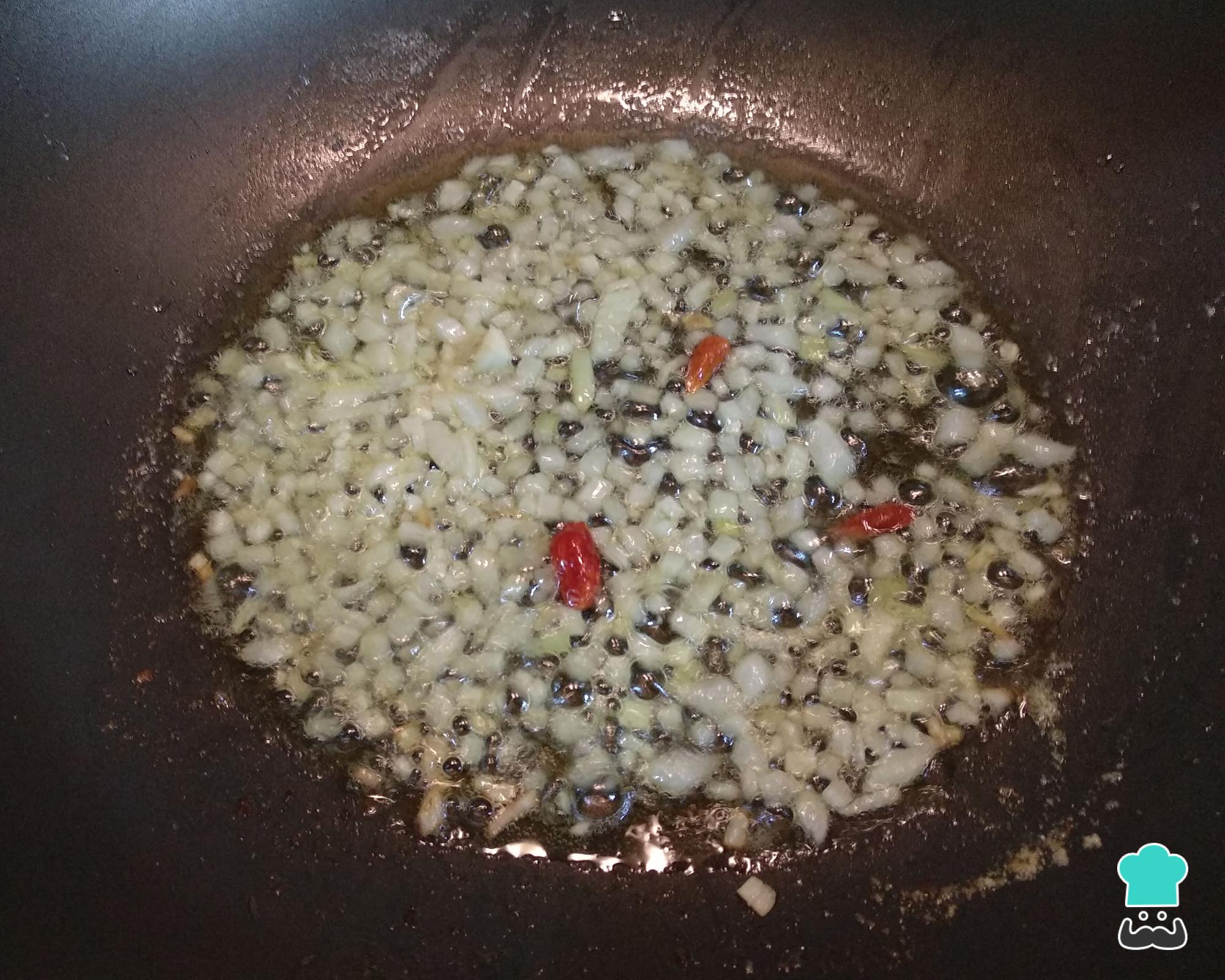 Enquanto isso, numa frigideira refogue a cebola, os alhos e as malaguetas na manteiga e azeite.
