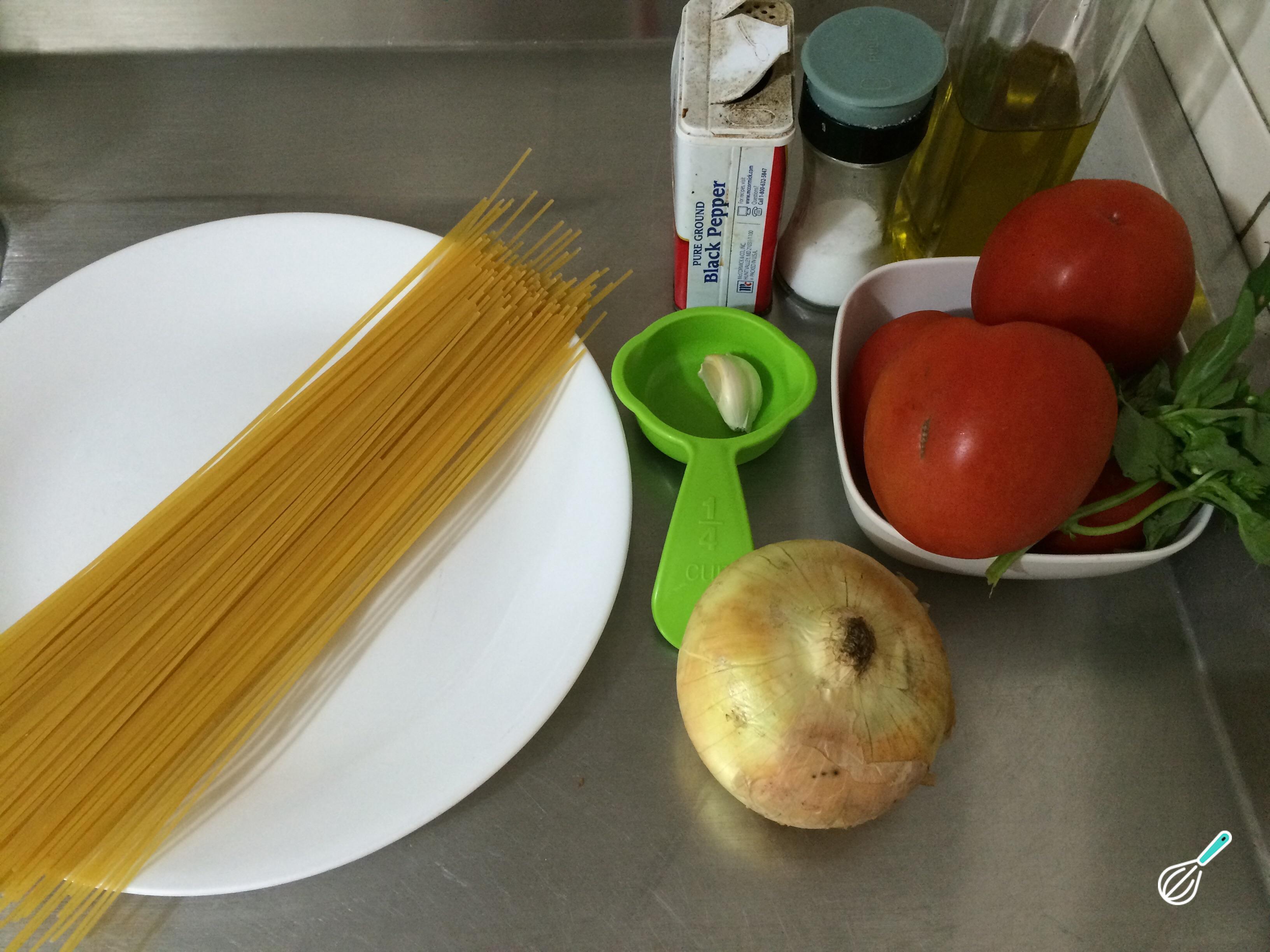 Antes de fazer esta deliciosa receita de macarrão prático, o primeiro passo é reunir os ingredientes.