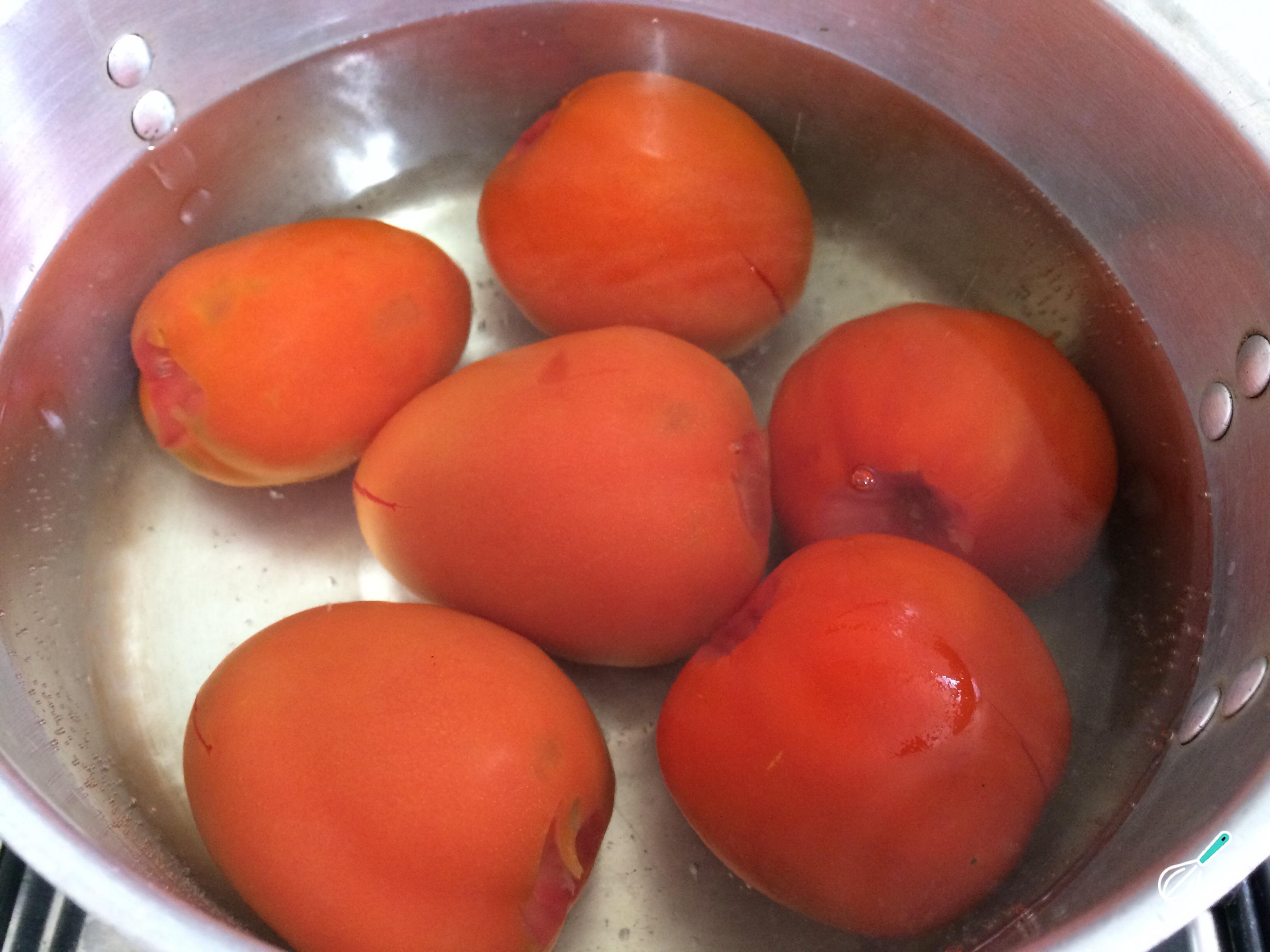 Em uma panela com água fervente acrescente os tomates, sem a rama e com um corte em forma de X na parte inferior. Deixe cozinhar por 5 minutos, depois retire a pele, bata no liquidificador ou com um mixer, e coe o suco.