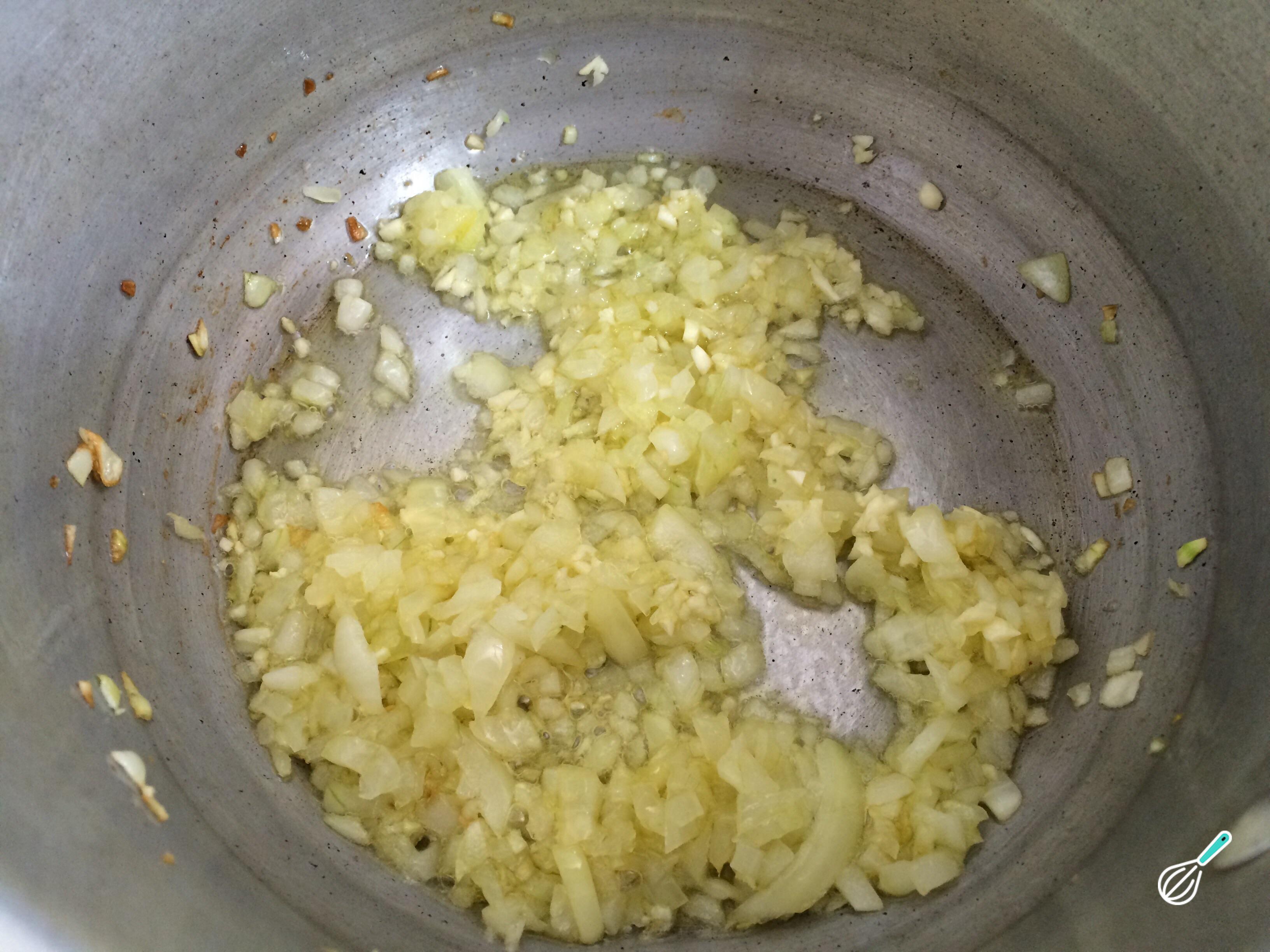 Leve uma outra panela ao fogo médio com o azeite, a cebola e os alhos, ambos picados finamente. Deixe refogar até a cebola ficar macia.